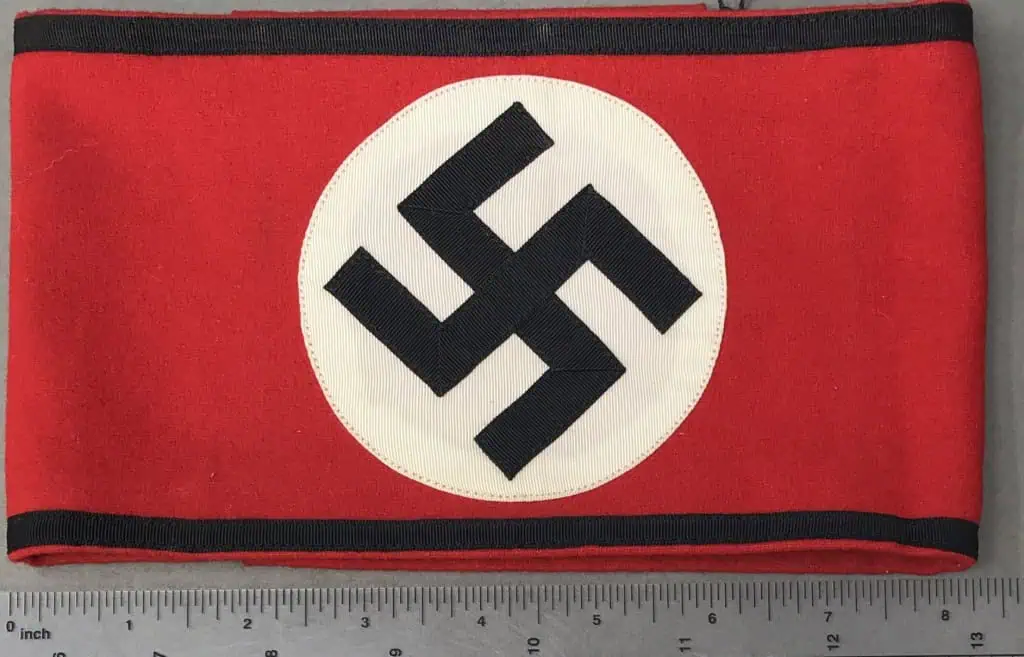 Original WWII Deluxe Nazi German SS Multi-Piece Construction Armband With SS-RZM Tag Brought Home By A U.S. Veteran. A U.S. vet bring back in good (almost mint) condition.. Deluxe version of the SS Nazi Arm Band. The most recognizable pieces of insignia associated with the Nazi regime is the swastika armband. Utilized by pretty much by all the organization of the Third Reich in one form or another. The swastika, (a Sanskrit word meaning “wellbeing”), is an ancient symbol that was utilized in numerous diverse cultures and signified both the cycle of life and the sun. The swastika was also a Nordic rune and the pagan Germanic symbol for Thor, God of Adventurers. A high-quality wool cloth materiel. approximately 9cm diameter rayon blend white disk, and high-quality multi-piece swastika. With BLACK SS Rayon stipe at top and bottom. Has the original SS-RZM TAG! (see photos) A nice high-quality example. A very good earlier example. Gettysburg Museum Certified (COA) provided. Rare 100% Guaranteed to be authentic, Brought home by a U.S Veteran as a trophy of war. Sold for historic purposes only. See our other pieces on our web site. Also note when browsing our web site there are several pages of items, at the bottom of the list look for other page numbers. Do not miss this one! OUTSTANDING EXAMPLE Almost Mint CONDITION! one small stain on the back (see photos) but very nice (almost Mint) ! SS items are very rare and desirable to collectors, and outstanding examples like this rarely come up for sale! VERY DESIRABLE WITH TAG! Uniform removed! Don’t miss it! If you want the best this is it!