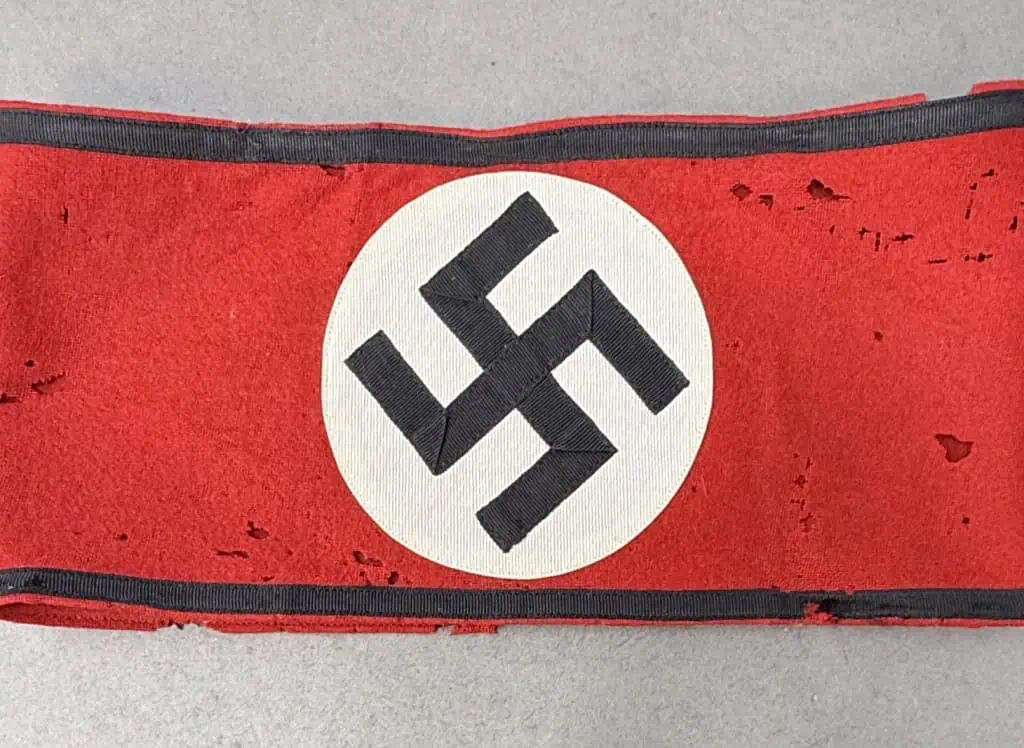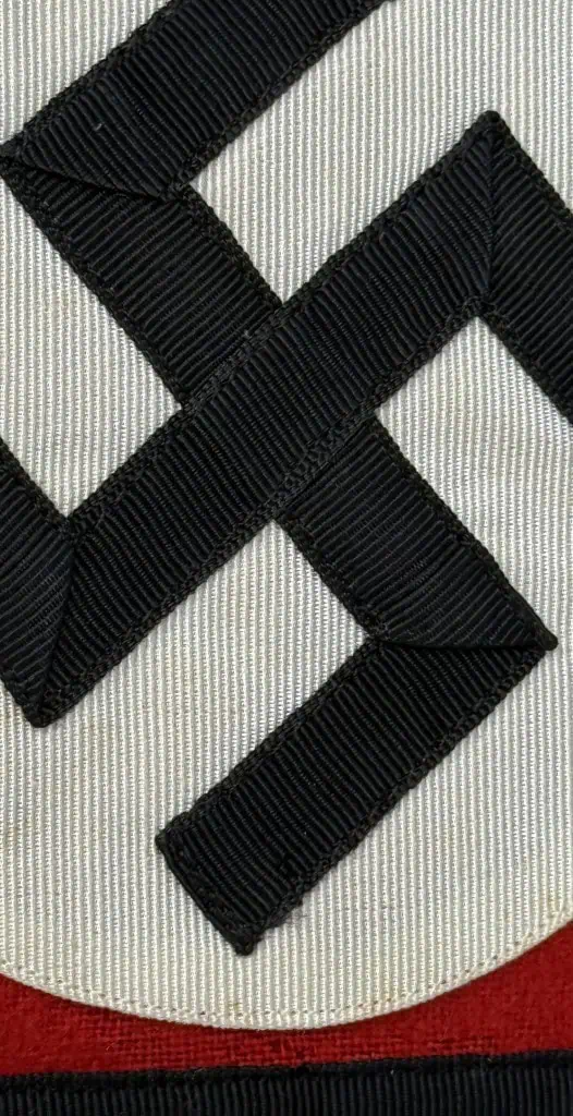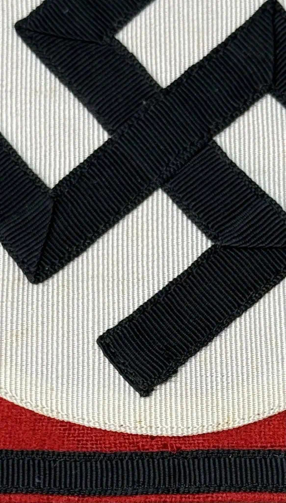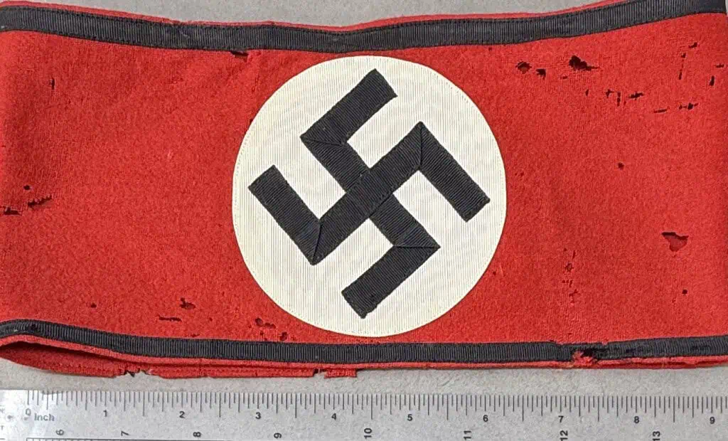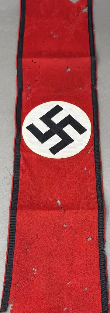 Original WWII Deluxe Nazi German SS Multi-Piece Construction Armband Brought Home By A U.S. Veteran. A U.S. vet bring back in good condition. Some very slight storage wear and mothing in used but good condition except some moth nips Deluxe version of the SS Nazi Arm Band. The most recognizable pieces of insignia associated with the Nazi regime is the swastika armband. Utilized by pretty much by all the organization of the Third Reich in one form or another. The swastika, (a Sanskrit word meaning “well being”), is an ancient symbol that was utilized in numerous diverse cultures and signified both the cycle of life and the sun. The swastika was also a Nordic rune and the pagan Germanic symbol for Thor, God of Adventurers. A high quality wool cloth materiel. approximately 9cm diameter rayon blend white disk, and high quality woven swastika. With BLACK SS Rayon stipe at top and bottom. (see photos) . This was removed from a black SS uniform nice high quality example. A very good earlier example. Gettysburg Museum Certified (COA) provided. Rare 100% Guaranteed to be authentic, Brought home by a U.S Veteran as a trophy of war. Sold for historic purposes only. See our other pieces on our web site. Also note when browsing our web site there are several pages of items, at the bottom of the list look for other page numbers. Do not miss this one! OUTSTANDING EXAMPLE GOOD MOTHED CONDITION With some loss from mothing (priced accordingly) ! SS items are very rare and desirable to collectors, and outstanding examples like this rarely come up for sale! Don’t miss it!