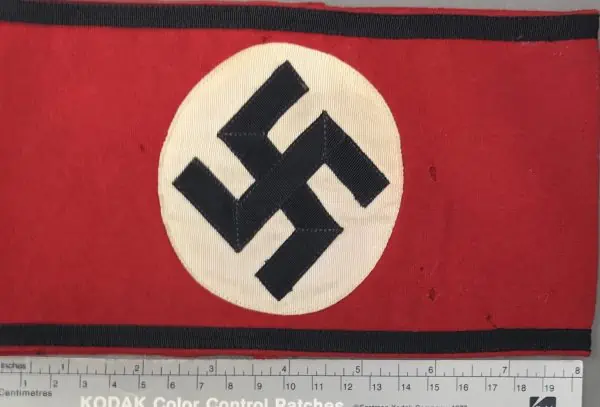 Original WWII Deluxe Nazi German SS Multi-Piece Construction Armband With SS-RZM Tag Brought Home By A U.S. Veteran. A U.S. vet bring back in good condition. Some very slight storage wear in used but good condition except some small moth nips. Deluxe version of the SS Nazi Arm Band. The most recognizable pieces of insignia associated with the Nazi regime is the swastika armband. Utilized by pretty much by all the organization of the Third Reich in one form or another. The swastika, (a Sanskrit word meaning “wellbeing”), is an ancient symbol that was utilized in numerous diverse cultures and signified both the cycle of life and the sun. The swastika was also a Nordic rune and the pagan Germanic symbol for Thor, God of Adventurers. A high-quality wool cloth materiel. approximately 9cm diameter rayon blend white disk, and high-quality multi-piece swastika. With BLACK SS Rayon stipe at top and bottom. Has the original SS-RZM TAG! (see photos) A nice high-quality example. A very good earlier example. Gettysburg Museum Certified (COA) provided. Rare 100% Guaranteed to be authentic, Brought home by a U.S Veteran as a trophy of war. Sold for historic purposes only. See our other pieces on our web site. Also note when browsing our web site there are several pages of items, at the bottom of the list look for other page numbers. Do not miss this one! OUTSTANDING EXAMPLE GOOD CONDITION! A few tiny moth nips but very nice! SS items are very rare and desirable to collectors, and outstanding examples like this rarely come up for sale! VERY DESIRABLE WITH TAG! Don’t miss it!