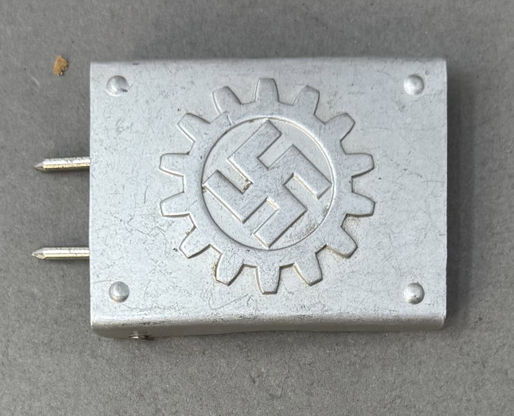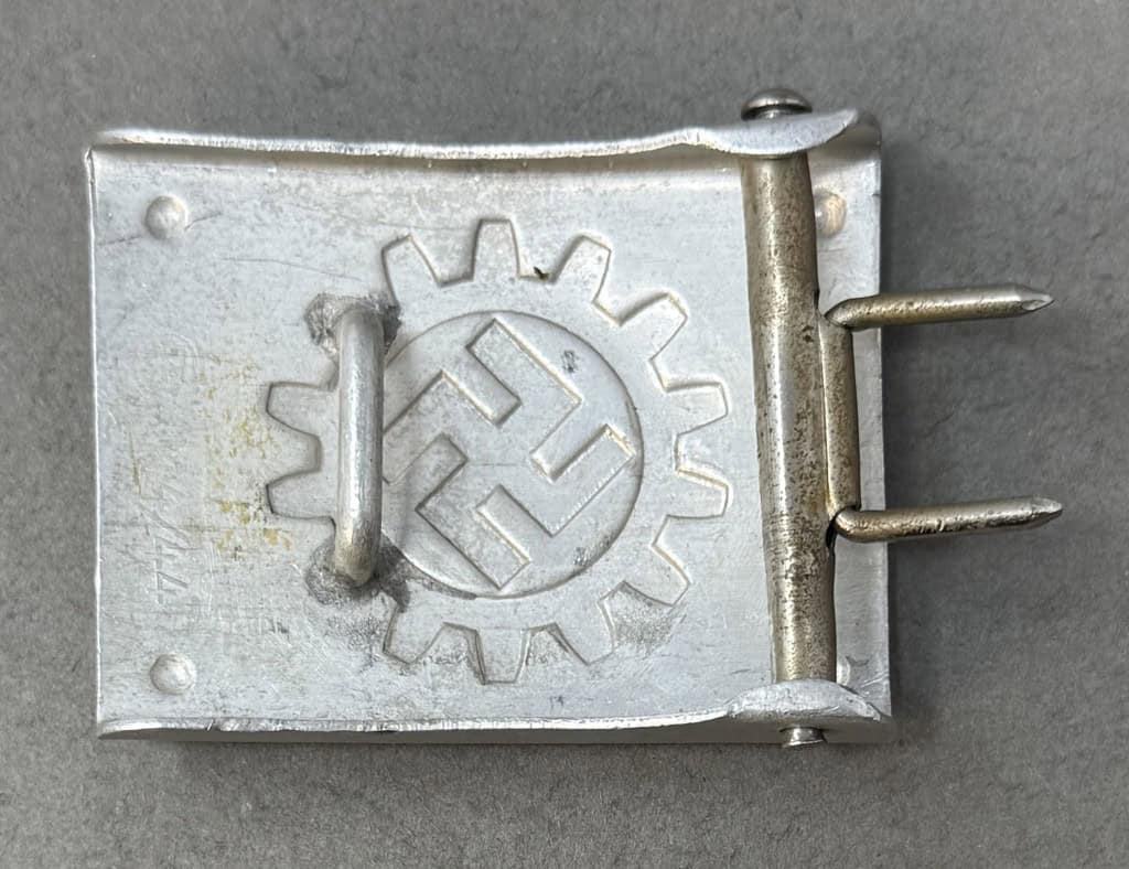 RARE ORIGINAL WWII GERMAN DAF BELT BUCKLE. (Koppelschloss) Brought Home By A U.S. Veteran Certified. With the dissolution of all Free Trade Unions in Germany in May 1933 the Deutsche Arbeitsfront, (German Labor Front), was established to replace the unions and to educate the workers in industry and commerce for smooth and efficient operation of all labor in the Third Reich. In October 1934 the DAF was given official status as a sub-section of the NSDAP and in March 1936 it was recognized as an independent NSDAP affiliated association and granted control of its own monetary budget. In 1934 the first pattern of DAF uniform was introduced for DAF Werkscharen, (Work Squads), and a belt buckle was introduced in late 1935 for wear by all ranks. Die stamped, natural aluminum, box buckle features a plain field with a high relief, embossed fourteen tooth cogwheel encompassing a canted swastika to center. Buckle also has a small embossed circular bead to each corner. Reverse with brazed buckle catch, prong bar, and prongs all intact. Reverse well marked with impressed RZM logo with single circular border and, “M4/44” One of the classic SCARCE belt buckles from the third Reich in used condition. Typical light age toning plus wear during use. Nice example issued with expected storage wear. Gettysburg Museum Certified (COA) provided. Rare 100% Guaranteed to be authentic. Sold for historic purposes only. See our other pieces on our web site. Also note when browsing our web site there are several pages of items, at the bottom of the list look for other page numbers. A Classic RARE BUCKLE!