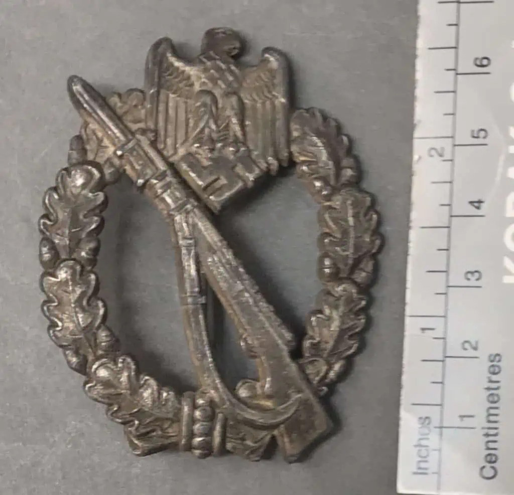 Original WWII German Infantry Assault Badge In Bronze Certified By The Gettysburg Museum Of History. The Infantry Assault Badge in silver was introduced on December 20TH 1939 by Oberbefehlshaber Walther von Brauchitsch, for award to Officers, and EM/NCO’s of non-motorized, Infantry and Mountain Infantry units. Criteria for the award varied, with the main qualification being participation in three separate Infantry assaults. Of Note: On June 1ST 1940 a bronze version of the Infantry Assault Badge was introduced for award to Officer’s, and EM/NCO’s of Motorized Infantry units. Die struck, solid backed, zinc construction badge with a bronzed washed finish features an embossed, vertically oval, oak-leaf wreath with a Wehrmacht style eagle with down-swept wings, clutching a canted swastika in its talons, superimposed to the top center, encompassing a cut-out, bolt action, rifle with a fixed bayonet and a sling. The reverse should have a crimped, soldered hinge, a thin, round, vertical, pin and a soldered catch are present. in good condition some of its original bronze wash still present. Has a period repair on the catch. Nicely maker marked. Complete Museum documentation (COA) Provided. Certified by The Gettysburg Museum of History. The Gettysburg Museum of History does not support or condone Adolf Hitler or the Nazi Party and is only offering this as a historic relic. Please see our other items. Also note when browsing our web site there are several pages of items, at the bottom of the list look for other page numbers. Good CONDITION VERY NICE some of the bronze wash still intact! Bronze versions are much rarer that silver versions!