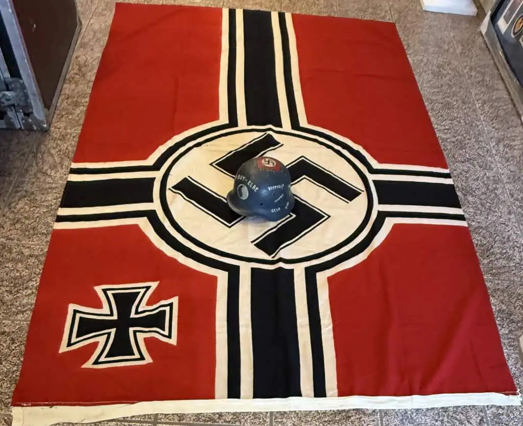 Original WWII German NSDAP (NAZI) NATIONAL WAR FLAG. (Reichskriegsflagge) Brought Home By A U.S. Veteran Certified. The national war flag was flown on all Kriegsmarine, (Navy), warships, Luftwaffe, (Air Force), airfields and all buildings owned by the Wehrmacht, (Armed Forces). The flag was also to be hoisted daily at all occupied barracks and was also utilized at victory parades and special events along with the standard national swastika flag. This example is the second pattern War Flag, circa 1937/38-1945. single piece, dual sided, printed wool/linen construction national war flag. The flag features a red base field with a central white/black/white/black bordered white disk with a black and white bordered black canted swastika to the center. The flag has black, vertical and horizontal bars emanating from the central disk with white/black/white borders. The canton features a white/black/white bordered black Iron Cross. The hoist edge has a small, dual-ply, reinforcement panel to each corner. The hoist edge is trimmed in white, tunnel looped, cotton/wool blend bunting size marked 150/205 (Centimeters) (59″/99″) and (ReichsKreigFLG ) marked. ” Nice used example good CONDITION except for some slight storage wear slight nips (see photo). We placed a helmet on the flag for size reference. A fantastic piece of history . This flag is A good quality version and one of the better display sizes for the most discriminating and cultivated collector. a very collectible flag with lots of history Nice period used flag captured by a U.S. Veteran and brought home as a war trophy. 100% Guaranteed to be authentic Brought home by a solider as a trophy of war. A very desirable displayable size . Complete museum documentation (COA) Provided. Certified by The Gettysburg Museum of History. The Gettysburg Museum of History does not support or condone Adolf Hitler or the Nazi Party and is only offering this as a historic relic. Please see our other items. Also note when browsing our web site there are several pages of items, at the bottom of the list look for other page numbers. Don’t miss it! KREIGS FLAGS ARE GETTING TOUGHER TO FIND!!!! VERY RARE MAKER! Don’t Miss This one! OUTSTANDING EXAMPLE!