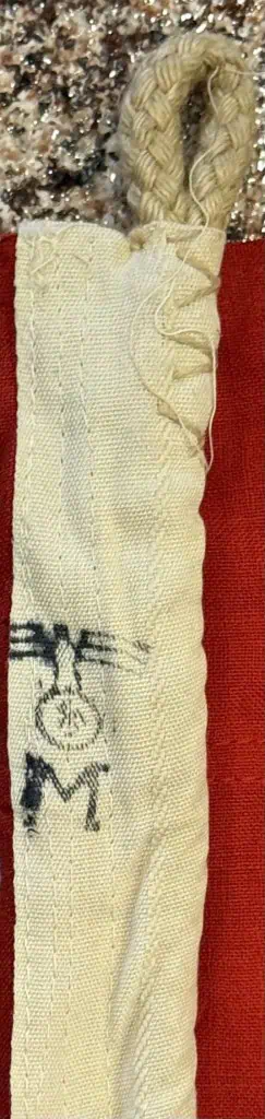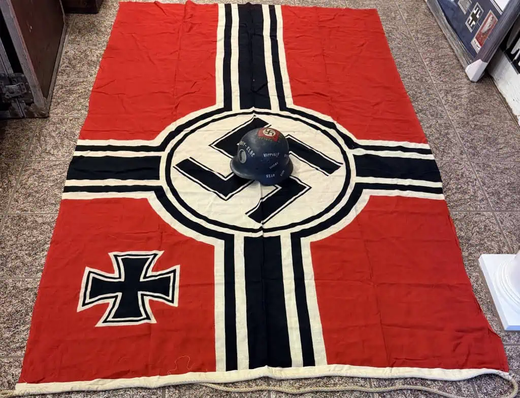 Original WWII German NSDAP (NAZI) NATIONAL WAR FLAG. (Reichskriegsflagge) Brought Home By A U.S. Veteran Certified. The national war flag was flown on all Kriegsmarine, (Navy), warships, Luftwaffe, (Air Force), airfields and all buildings owned by the Wehrmacht, (Armed Forces). The flag was also to be hoisted daily at all occupied barracks and was also utilized at victory parades and special events along with the standard national swastika flag. This example is the second pattern War Flag, circa 1937/38-1945. single piece, dual sided, printed wool/linen construction national war flag. The flag features a red base field with a central white/black/white/black bordered white disk with a black and white bordered black canted swastika to the center. The flag has black, vertical and horizontal bars emanating from the central disk with white/black/white borders. The canton features a white/black/white bordered black Iron Cross. The hoist edge has a small, dual-ply, reinforcement panel to each corner. The hoist edge is trimmed in white, tunnel looped, cotton/wool blend bunting size marked 150/250 (centimeters) (59″/99″) and (ReichsKreigFLG ) marked. ” Nice used example good used CONDITION (see photo). We placed a helmet on the flag for size reference. A fantastic piece of history . This flag is A good quality version and one of the better display sizes for the most discriminating and cultivated collector. a very collectible flag with lots of history Nice period used flag captured by a U.S. Veteran and brought home as a war trophy. 100% Guaranteed to be authentic Brought home by a solider as a trophy of war. A very desirable displayable size . Complete museum documentation (COA) Provided. Certified by The Gettysburg Museum of History. The Gettysburg Museum of History does not support or condone Adolf Hitler or the Nazi Party and is only offering this as a historic relic. Please see our other items. Also note when browsing our web site there are several pages of items, at the bottom of the list look for other page numbers. Don’t miss it! KREIGS FLAGS ARE GETTING TOUGHER TO FIND!!!! In used Condition! ! A few pin holes otherwise almost MINT Don’t Miss This one!