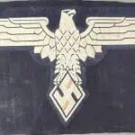 Original WWII German NSDAP (NAZI) NATIONAL WAR FLAG. (Reichskriegsflagge) Brought Home By A U.S. Veteran Certified. The national war flag was flown on all Kriegsmarine, (Navy), warships, Luftwaffe, (Air Force), airfields and all buildings owned by the Wehrmacht, (Armed Forces). The flag was also to be hoisted daily at all occupied barracks and was also utilized at victory parades and special events along with the standard national swastika flag. This example is the second pattern War Flag, circa 1937/38-1945. single piece, dual sided, printed wool/linen construction national war flag. The flag features a red base field with a central white/black/white/black bordered white disk with a black and white bordered black canted swastika to the center. The flag has black, vertical and horizontal bars emanating from the central disk with white/black/white borders. The canton features a white/black/white bordered black Iron Cross. The hoist edge has a small, dual-ply, reinforcement panel to each corner. The hoist edge is trimmed in white, tunnel looped, cotton/wool blend bunting size marked 150/250 (centimeters) (59″/99″) and (ReichsKreigFLG ) marked. ” Nice used example good used CONDITION (see photo). We placed a helmet on the flag for size reference. A fantastic piece of history . This flag is A good quality version and one of the better display sizes for the most discriminating and cultivated collector. a very collectible flag with lots of history Nice period used flag captured by a U.S. Veteran and brought home as a war trophy. 100% Guaranteed to be authentic Brought home by a solider as a trophy of war. A very desirable displayable size . Complete museum documentation (COA) Provided. Certified by The Gettysburg Museum of History. The Gettysburg Museum of History does not support or condone Adolf Hitler or the Nazi Party and is only offering this as a historic relic. Please see our other items. Also note when browsing our web site there are several pages of items, at the bottom of the list look for other page numbers. Don’t miss it! KREIGS FLAGS ARE GETTING TOUGHER TO FIND!!!! In used Condition! ! A few pin holes otherwise almost MINT Don’t Miss This one!