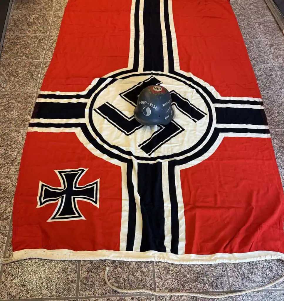 Original WWII German NSDAP (NAZI) NATIONAL WAR FLAG. (Reichskriegsflagge) Brought Home By A U.S. Veteran Certified. The national war flag was flown on all Kriegsmarine, (Navy), warships, Luftwaffe, (Air Force), airfields and all buildings owned by the Wehrmacht, (Armed Forces). The flag was also to be hoisted daily at all occupied barracks and was also utilized at victory parades and special events along with the standard national swastika flag. This example is the second pattern War Flag, circa 1937/38-1945. single piece, dual sided, printed wool/linen construction national war flag. The flag features a red base field with a central white/black/white/black bordered white disk with a black and white bordered black canted swastika to the center. The flag has black, vertical and horizontal bars emanating from the central disk with white/black/white borders. The canton features a white/black/white bordered black Iron Cross. The hoist edge has a small, dual-ply, reinforcement panel to each corner. The hoist edge is trimmed in white, tunnel looped, cotton/wool blend bunting size marked 150/250 (centimeters) (59″/99″) and (KRFL) marked. ” Nice used example good used CONDITION (see photo). We placed a helmet on the flag for size reference. A fantastic piece of history . This flag is A good quality version and one of the better display sizes for the most discriminating and cultivated collector. a very collectible flag with lots of history Nice period used flag captured by a U.S. Veteran and brought home as a war trophy. 100% Guaranteed to be authentic Brought home by a solider as a trophy of war. A very desirable displayable size . Complete museum documentation (COA) Provided. Certified by The Gettysburg Museum of History. The Gettysburg Museum of History does not support or condone Adolf Hitler or the Nazi Party and is only offering this as a historic relic. Please see our other items. Also note when browsing our web site there are several pages of items, at the bottom of the list look for other page numbers. Don’t miss it! KREIGS FLAGS ARE GETTING TOUGHER TO FIND!!!! In used Condition! ! A few pin holes (mothing) otherwise good used very clean condition Don’t Miss This one!