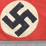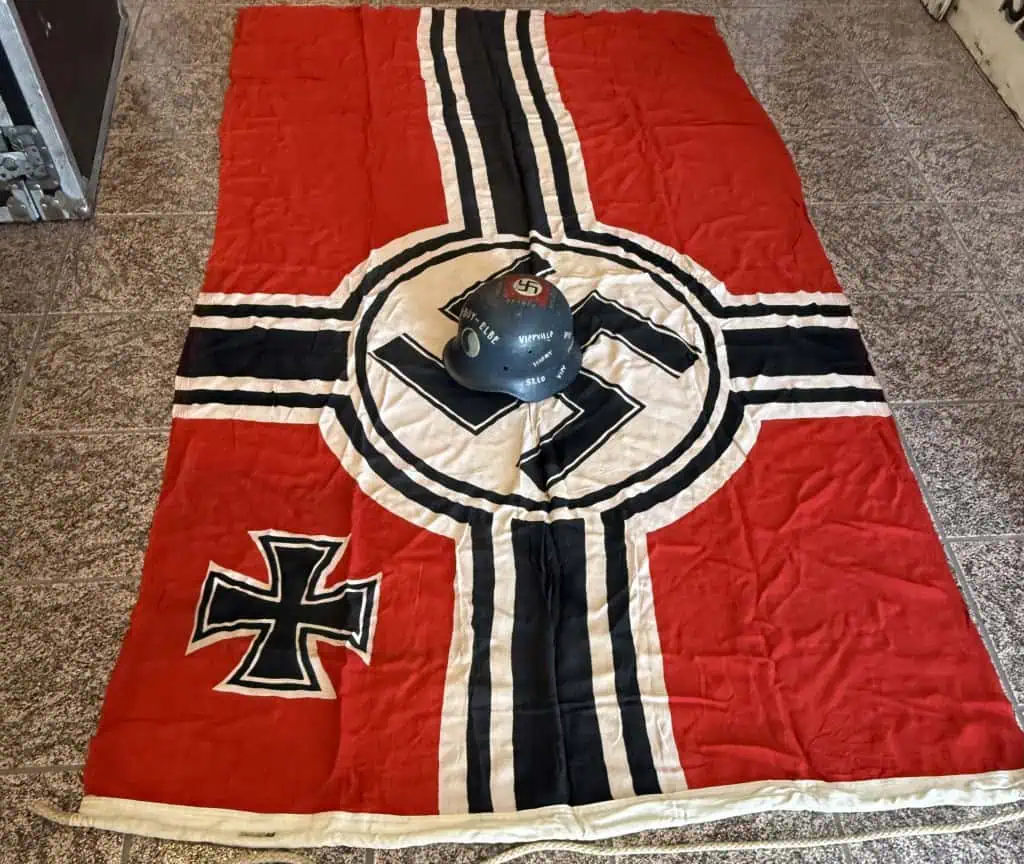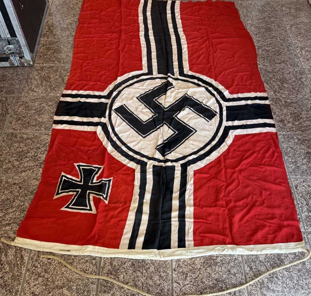 Original WII German NSDAP (NAZI) NATIONAL WAR FLAG. (Reichskriegsflagge) Brought Home By A U.S. Veteran Certified. The national war flag was flown on all Kriegsmarine, (Navy), warships, Luftwaffe, (Air Force), airfields and all buildings owned by the Wehrmacht, (Armed Forces). The flag was also to be hoisted daily at all occupied barracks and was also utilized at victory parades and special events along with the standard national swastika flag. This example is the second pattern War Flag, circa 1937/38-1945. single piece, dual sided, printed wool/linen construction national war flag. The flag features a red base field with a central white/black/white/black bordered white disk with a black and white bordered black canted swastika to the center. The flag has black, vertical and horizontal bars emanating from the central disk with white/black/white borders. The canton features a white/black/white bordered black Iron Cross. The hoist edge has a small, dual-ply, reinforcement panel to each corner. The hoist edge is trimmed in white, tunnel looped, cotton/wool blend bunting  size marked 150/250 (centimeters)  (59″/99″) and   (Reichskriegsflg ) marked. ” Nice used example good almost MINT CONDITION except for a few pin holes  (see photo). We placed a helmet on the flag for size reference.  A fantastic piece of   history .  This flag is  A good quality version and one of the better display  sizes for the most  discriminating and cultivated collector. a very collectible flag with lots of history Nice period used flag captured by a U.S. Veteran and brought home as a war trophy. 100% Guaranteed to be authentic Brought home by a solider as a trophy of war. A very desirable displayable size . Complete museum documentation (COA) Provided. Certified by The Gettysburg Museum of History. The Gettysburg Museum of History does not support or condone Adolf Hitler or the Nazi Party and is only offering this as a historic relic. Please see our other items.  Also note when browsing our web site there are several pages of items, at the bottom of the list look for other page numbers.   Don’t miss it! KREIGS FLAGS ARE GETTING TOUGHER TO FIND!!!! In almost mint  Condition except a few small spots (see photos) Don’t Miss This one!