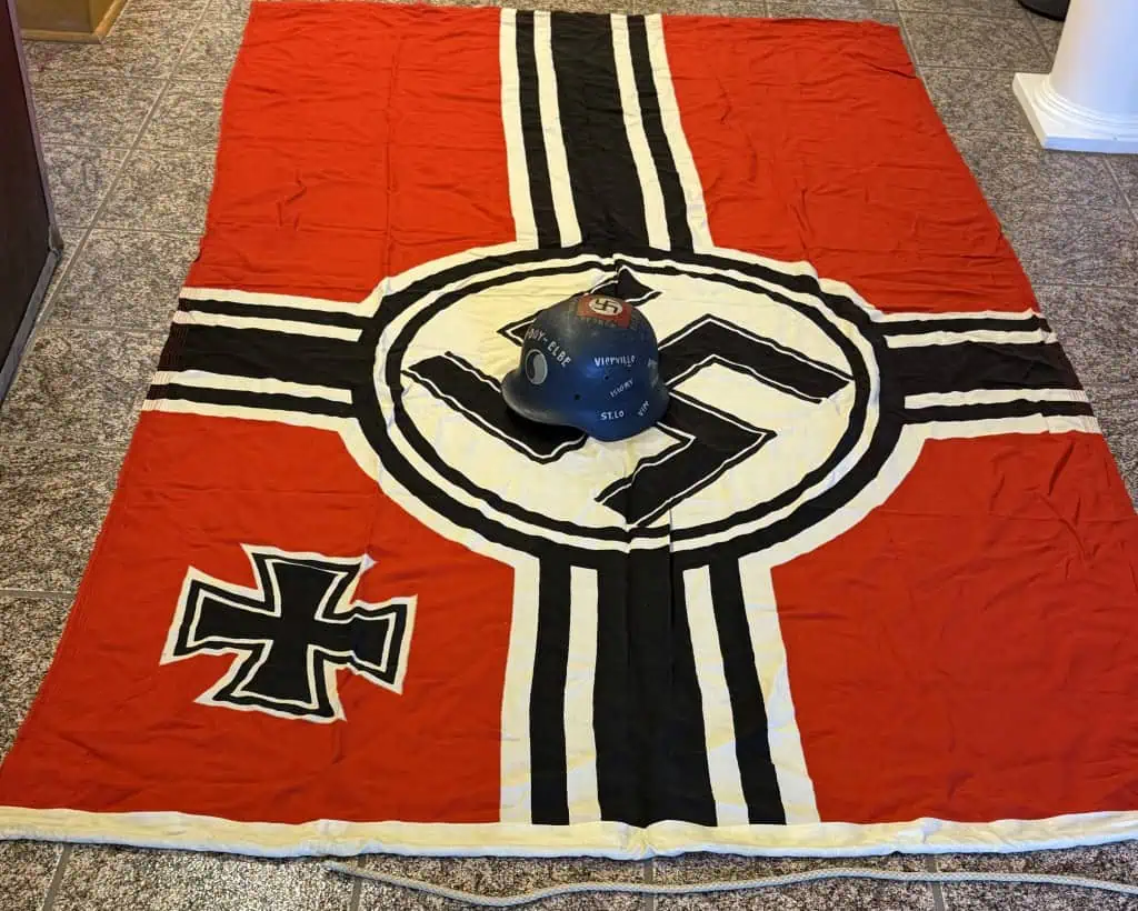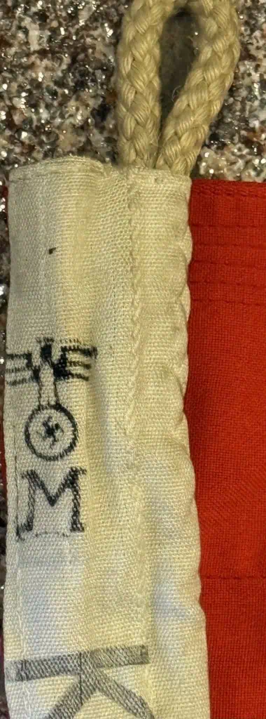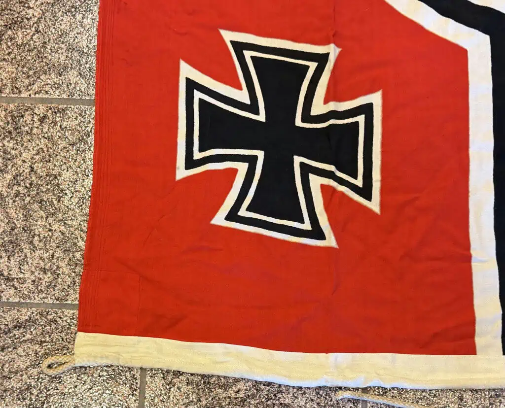 Original WII German NSDAP (NAZI) NATIONAL WAR FLAG. (Reichskriegsflagge) Brought Home By A U.S. Veteran Certified. The national war flag was flown on all Kriegsmarine, (Navy), warships, Luftwaffe, (Air Force), airfields and all buildings owned by the Wehrmacht, (Armed Forces). The flag was also to be hoisted daily at all occupied barracks and was also utilized at victory parades and special events along with the standard national swastika flag. This example is the second pattern War Flag, circa 1937/38-1945. single piece, dual sided, printed wool/linen construction national war flag. The flag features a red base field with a central white/black/white/black bordered white disk with a black and white bordered black canted swastika to the center. The flag has black, vertical and horizontal bars emanating from the central disk with white/black/white borders. The canton features a white/black/white bordered black Iron Cross. The hoist edge has a small, dual-ply, reinforcement panel to each corner. The hoist edge is trimmed in white, tunnel looped, cotton/wool blend bunting size marked 150/250 (centimeters) (59″/99″) and KrFL (Reichskriegsflg ) marked. ” Nice used example good almost MINT CONDITION except for a few tiny spots (see photo). We placed a helmet on the flag for size reference. A fantastic piece of history . This flag is A good quality version and one of the better display sizes for the most discriminating and cultivated collector. a very collectible flag with lots of history Nice period used flag captured by a U.S. Veteran and brought home as a war trophy. 100% Guaranteed to be authentic Brought home by a solider as a trophy of war. A very desirable displayable size . Complete museum documentation (COA) Provided. Certified by The Gettysburg Museum of History. The Gettysburg Museum of History does not support or condone Adolf Hitler or the Nazi Party and is only offering this as a historic relic. Please see our other items. Also note when browsing our web site there are several pages of items, at the bottom of the list look for other page numbers. Don’t miss it! KREIGS FLAGS ARE GETTING TOUGHER TO FIND!!!! In almost mint Condition except a few small spots (see photos) Don’t Miss This one RARE MUNICH MAKER STAMP!