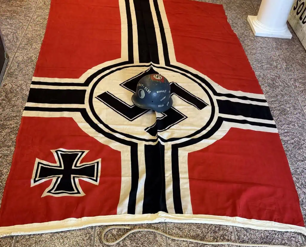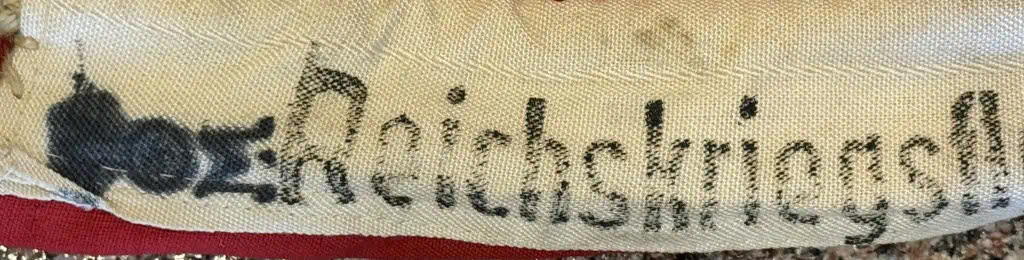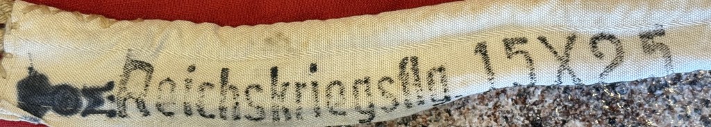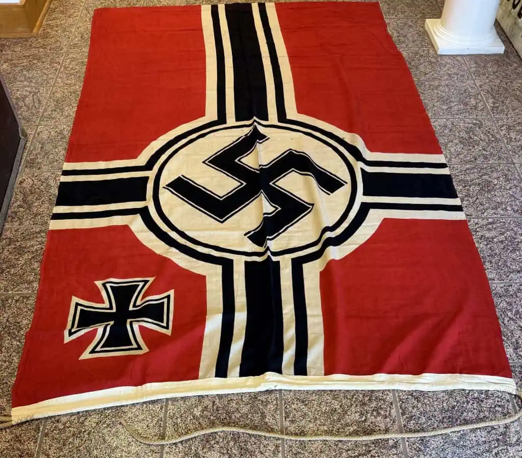 Original WWII German NSDAP (NAZI) NATIONAL WAR FLAG. (Reichskriegsflagge) Brought Home By A U.S. Veteran Certified. The national war flag was flown on all Kriegsmarine, (Navy), warships, Luftwaffe, (Air Force), airfields and all buildings owned by the Wehrmacht, (Armed Forces). The flag was also to be hoisted daily at all occupied barracks and was also utilized at victory parades and special events along with the standard national swastika flag. This example is the second pattern War Flag, circa 1937/38-1945. single piece, dual sided, printed wool/linen construction national war flag. The flag features a red base field with a central white/black/white/black bordered white disk with a black and white bordered black canted swastika to the center. The flag has black, vertical and horizontal bars emanating from the central disk with white/black/white borders. The canton features a white/black/white bordered black Iron Cross. The hoist edge has a small, dual-ply, reinforcement panel to each corner. The hoist edge is trimmed in white, tunnel looped, cotton/wool blend bunting size marked 15/25 (meters) (59″/99″) and (ReichsKreigFLG ) marked. ” Nice used example good used CONDITION except for some slight storage wear and slight mothing (see photo). We placed a helmet on the flag for size reference. A fantastic piece of history . This flag is A good quality version and one of the better display sizes for the most discriminating and cultivated collector. a very collectible flag with lots of history Nice period used flag captured by a U.S. Veteran and brought home as a war trophy. 100% Guaranteed to be authentic Brought home by a solider as a trophy of war. A very desirable displayable size . Complete museum documentation (COA) Provided. Certified by The Gettysburg Museum of History. The Gettysburg Museum of History does not support or condone Adolf Hitler or the Nazi Party and is only offering this as a historic relic. Please see our other items. Also note when browsing our web site there are several pages of items, at the bottom of the list look for other page numbers. Don’t miss it! KREIGS FLAGS ARE GETTING TOUGHER TO FIND!!!! In used Condition! VERY RARE MAKER! Don’t Miss This one!