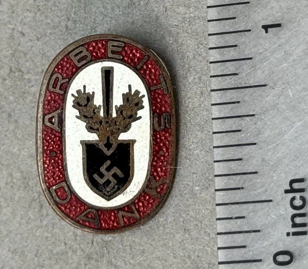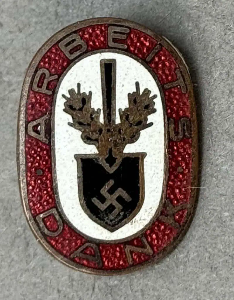 RARE Original WWII German NSDAP (NAZI PARTY) RAD “ARBEITS DANK” LAPEL PIN. (Mitgliednadel) Certified. The, “Arbeits Dank”, (Labor Thanks), was an internal organization of the NSAD, Nationalsozialist Arbeitsdienst, (National Socialist Labor Service), a forerunner of the RAD, Reichsarbeitsdienst, (National Labor Service), and was established in 1933 to help provide welfare assistance to members who had suffered work related injuries or illness, or to assist with further employment related education. Membership in the Arbeits Dank and monetary donations were compulsory for all NSAD/RAD personnel. Roughly, 22mm tall, 15mm wide, vertically oval, die struck alloy lapel pin with multi-colored enamel work. The pin features a translucent red outer border with an underlying textured background with inlaid silvered script, “Arbeits Dank”. The red outer border encompasses a white inner oval with a silver bordered, black spade head with a canted, central, swastika. The spade handle is flanked by diagonally angled sheaves of wheat. , The reverse has its vertical pin back device. 100% guaranteed to be authentic complete museum documentation (COA) provided. An amazing historical artifact! See our other pieces on our web site. RARE! Don’t miss this!