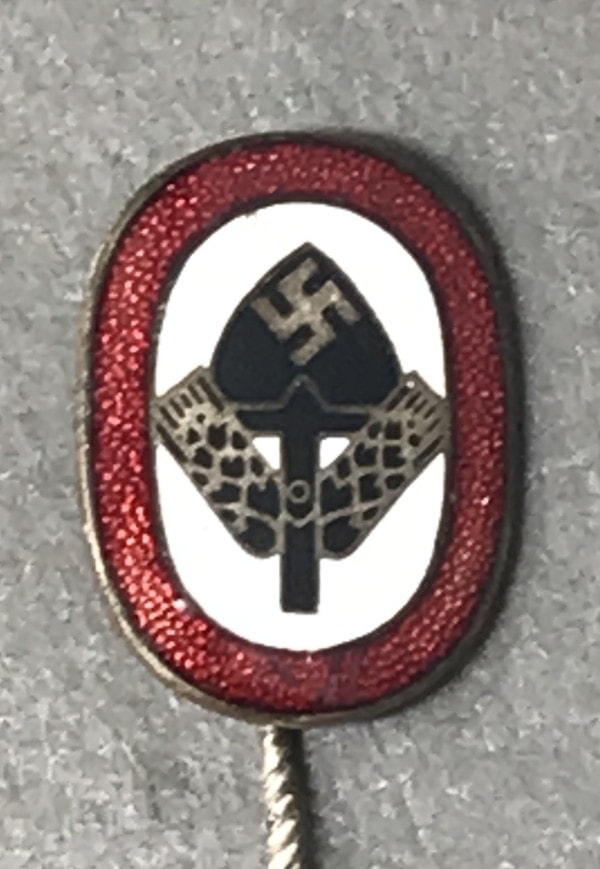 RARE Original WWII German NSDAP (NAZI PARTY) RAD MEMBERS STICK PIN. The basis of the Reichsarbeitsdienst, (National Labor Service), dates back, at least, to 1929 with the formation of the AAD, Anhalt Arbeitsdienst, (Anhalt Labor Service), and the FAD-B, Freiwillingen Arbeitsdienst-Bayern, (Volunteer Labor Service Bavaria). Shortly after Hitler’s appointment as Chancellor, (January 30TH 1933), the NSDAP consolidated these, and other labor organizations into the NSAD, Nationalsozialist Arbeitsdienst, (National Socialist Labor Service), under the control of Reichsarbeitsführer Konstatin Hierl. On June 26TH 1935 the NSAD was re-designated RAD. In July 1935 RAD service became compulsory, with all German citizens between 19 and 25 years of age required to enlist for a six month term. Of Note: This law also decreed that all military conscripts serve a nine month term. Besides specific RAD awards all RAD personnel were eligible for all national awards if they met the required criteria. All RAD personnel were given a commemorative enamel lapel pin, on the completion of their compulsory service. The 16mm x 22mm vertical oval pin has a pebbled red surround, with gilt edging inside and out, and, to its central white field, the RAD emblem of an upright, pointed spade head with a mobile swastika to its center and dual sheaves of wheat projecting diagonally upwards from its base. The emblem is in black, with its swastika and articulations in gilt. To the reverse is a 50mm long rifled pin and, embossed beneath its soldered base, “RAD” within a triangle. Also present is the makers mark . We have a few from a collection. 100% guaranteed to be authentic complete museum documentation (COA) provided. An amazing historical artifact! See our other pieces on our web site. RARE! Don’t miss this!
