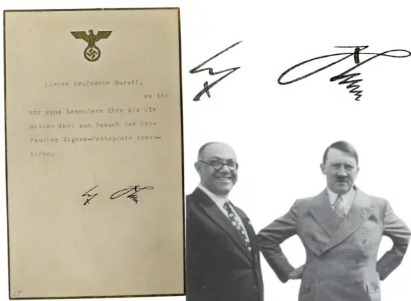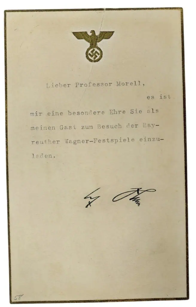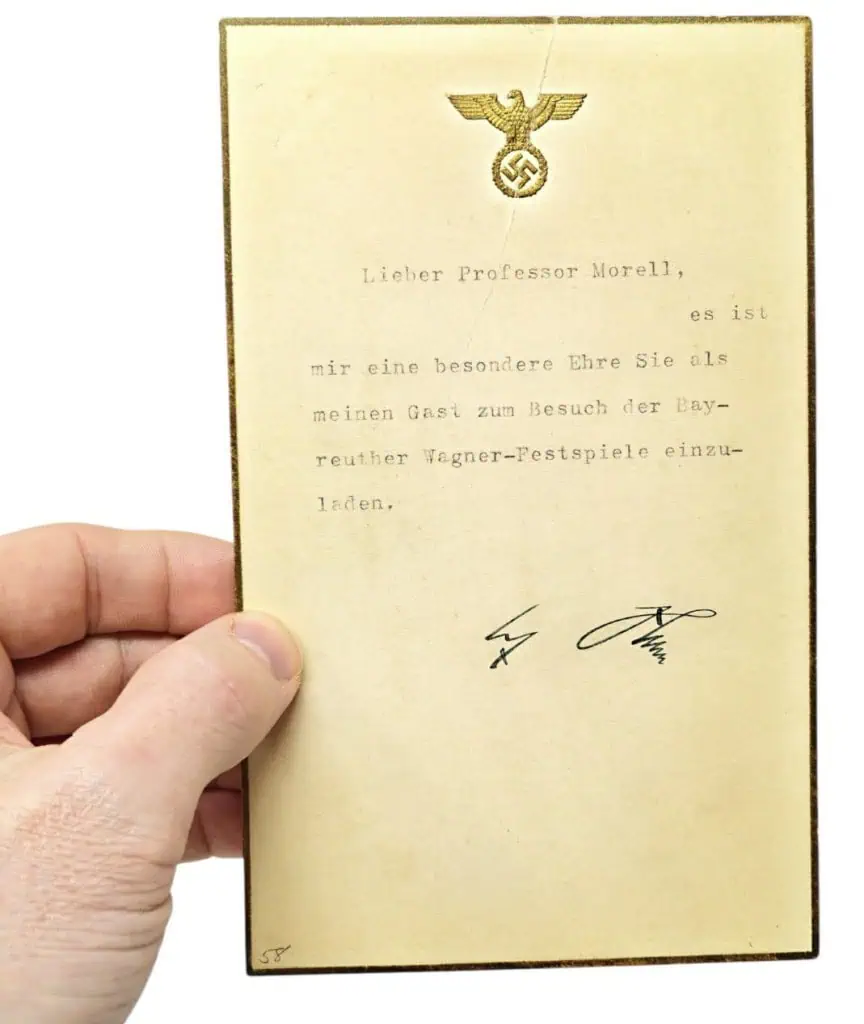 RARE ORIGINAL INVITATION, SIGNED (AUTOGRAPHED) BY ADOLF HITLER TO HIS DOCTOR CERTIFIED. A rare original invitation letter on official Third Reich card, featuring the Reich eagle with swastika at the top, personally signed by Adolf Hitler to his doctor Theodor Morrell. The typed German text is addressed to Professor Theodor Morell, Hitler’s personal physician, and reads in translation: “Dear Professor Morell, it is a special honor for me to invite you as my guest to attend the Bayreuth Wagner Festival.” The letter reflects Hitler’s well-documented personal devotion to the music and legacy of Richard Wagner and the ideological importance he placed on the Bayreuth Festival, which he regarded as a cultural and political showcase of National Socialist Germany. Invitations to Bayreuth issued directly by Hitler were marks of exceptional favor and access.. Complete museum documentation (COA) Provided. Certified by The Gettysburg Museum of History. 100% guaranteed to be authentic. The Gettysburg Museum of History does not support or condone Adolf Hitler or the Nazi Party and is only offering this as a historic relic. Please see our other items. Also note when browsing our web site there are several pages of items, at the bottom of the list look for other page numbers. Hitler Autographs are RARE and Very Desirable To Collectors And Historians! DO NOT MISS THIS! Great autograph with lots of history. VERY HISTORIC!