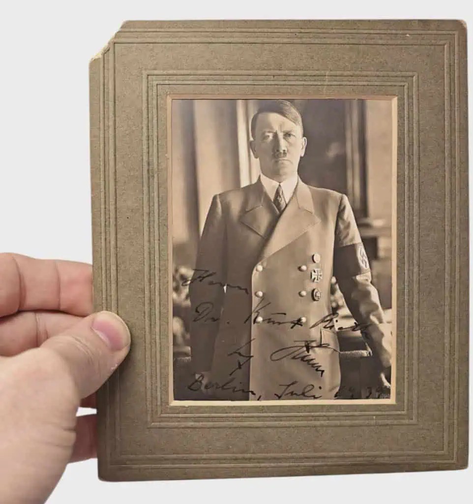 RARE ORIGINAL OVERSIZE PHOTOGRAPH, SIGNED (AUTOGRAPHED) BY ADOLF HITLER CERTIFIED. Adolf Hitler signed photo by Hoffman. The photo is signed in black fountain pen and is a classic photo. On the front is a very dark and bold signature of Adolf Hitler hand signed (autographed) in black fountain pen ink. It is inscribed by Hitler to Dr. Kurt Richter. This bold dark signature it is in a good clear area it can be clearly seen. We photographed it at an angle so you can clearly see it’s hand-signed and not pre-printed or stamped. See the fountain pen strokes in this fine signature! A rare photo of Hitler. This autographed photo is in good condition with minor storage wear (see photo). The overall size of the photo with the mat is large about 8″/10″. Complete museum documentation (COA) Provided. Certified by The Gettysburg Museum of History. 100% guaranteed to be authentic. The Gettysburg Museum of History does not support or condone Adolf Hitler or the Nazi Party and is only offering this as a historic relic. Please see our other items. Also note when browsing our web site there are several pages of items, at the bottom of the list look for other page numbers. Hitler Autographed photographs are RARE and Very Desirable To Collectors And Historians! DO NOT MISS THIS! Investment quality! This is the choice early Hitler photograph OUTSTANDING TO A RARE HITLER DOCTOR!