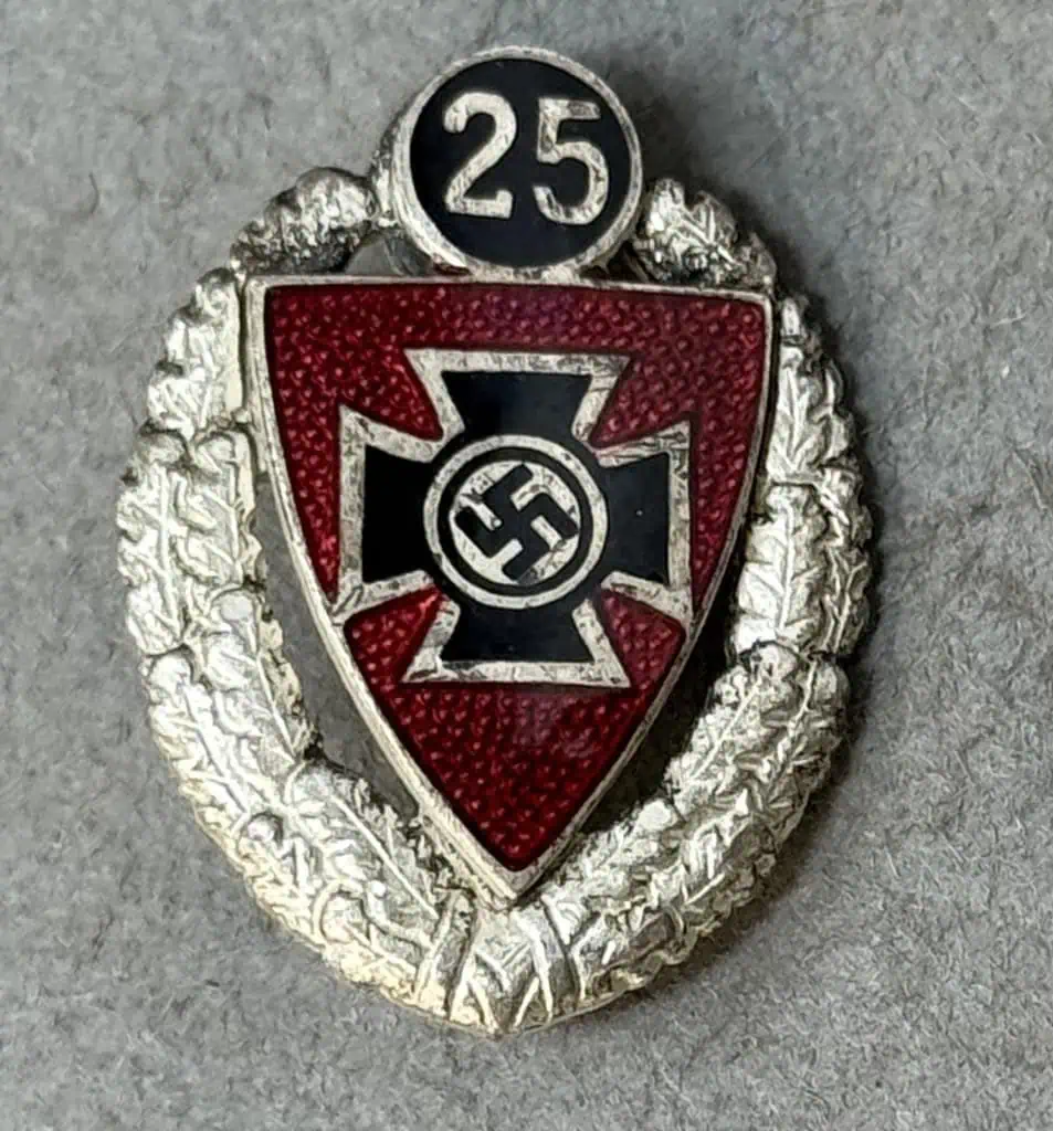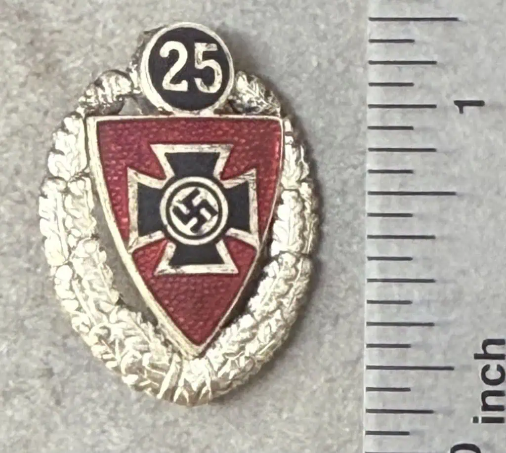 Scarce Original WWII German NS-RKB 25 YEAR MEMBER’S PIN. (Mitgliednadel) Brought Home By A U.S. Veteran Certified. The DRKB, “Deutscher Reichskriegerbund” (German National-veterans’-league), was formed during WWI, and was based on the DKB, “Deutscher Kriegerbund,” originally formed after the Franco-Prussian war in the 1870s. By 1936 it had incorporated most of the varied veterans’ associations into it, and was itself re-named the NS-RKB, “Nationalsozialistische-Reichskriegerbund,” in 1938. A gilt washed and enameled, 24mm x 20mm, lapel pin comprised of a silver washed oak-leaf wreath encompassing a translucent red enamel shield, bordered in silver, with a silver bordered black enamel Iron Cross with a mobile swastika to its center. A small scuff to the face (See Photo). To the bottom of the pin is the number “25” in silver on a black enamel, bordered in silver, circular base. The reverse is marked “Ges Gesch” and maker numbered. Its pin-back device is fully intact. Nice example U.S. Veteran bring-back. Gettysburg Museum Certified (COA) provided. Rare 100% Guaranteed to be authentic. Sold for historic purposes only. See our other pieces on our web site. Also note when browsing our web site there are several pages of items, at the bottom of the list look for other page numbers. OUTSTANDING EXAMPLE! RARE BADGE!