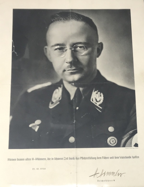 SS Leader Heinrich Himmler Print Signed (Autographed) By Himmler. An original portrait print of Himmler by his personal photographer Friedrich Franz Bauer. This photo is hand signed (autographed) by SS leader Heinrich Himmler in dark bold fountain ink. . It is about 16″/20″ The print has some signs of storage wear and was originally mailed folded. This is an investment quality autograph and with prices skyrocketing this is a rare opportunity. Complete museum documentation (COA) Provided. Certified by The Gettysburg Museum of History. The Gettysburg Museum of History does not support or condone Adolf Hitler or the Nazi Party and is only offering this as a historic relic. Please see our other items. Also note when browsing our web site there are several pages of items, at the bottom of the list look for other page numbers. RARE! Don’t miss this one! Signed By Himmler Simply Amazing! This is by far the largest Himmler signed print we ever offered. For the advanced collector who wants the very best!