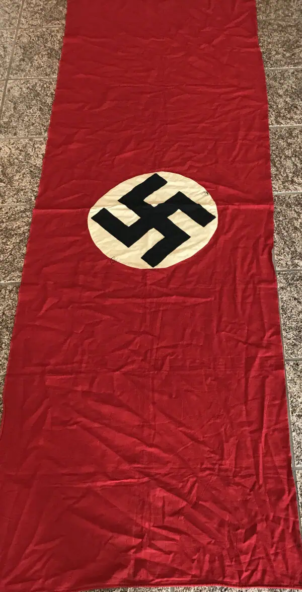 Original WWII Era German Nazi Party Flag Certified. A standard type flag. Utilized by pretty much by all the organization of the Third Reich in one form or another. The swastika, (a Sanskrit word meaning “well-being”), is an ancient symbol that was utilized in numerous diverse cultures and signified both the cycle of life and the sun. The swastika was also a Nordic rune and the pagan Germanic symbol for Thor, God of Adventurers. In good condition double sided LARGE 30″/91!!! standard cotton bunting style material with screened white disk and screened swastika. We placed a helmet on the flag for size comparison (see photos). A fantastic piece of WWII history (see photos). In good condition with very minor storage wear (see photos). IT HAS TWO RARE NSDAP (NAZI PARTY) Eagle STAMP! (See photos) This flag is a good quality version and one of the better sizes for the most discriminating and cultivated collector. Overall, a very collectible flag with lots of history. Nice period used flag captured by a U.S. Veteran and brought home as a war trophy. Nice used example showing the expected age 100% Guaranteed to be authentic Brought home by a solider as a trophy of war. A very desirable size in good condition an outstanding example some light staining (minor). Don’t miss this one! RARE in this size. Complete museum documentation (COA) Provided. Certified by The Gettysburg Museum of History. The Gettysburg Museum of History does not support or condone Adolf Hitler or the Nazi Party and is only offering this as a historic relic. Please see our other items. Also note when browsing our web site there are several pages of items, at the bottom of the list look for other page numbers. RARE IN THIS SIZE. OUTSTANDING EXAMPLE! NSDAP FLAGS ARE GETTING TOUGHER TO FIND! Don’t Miss It!!!! VERY RARE WITH 2x NSDAP EAGLE STAMPS