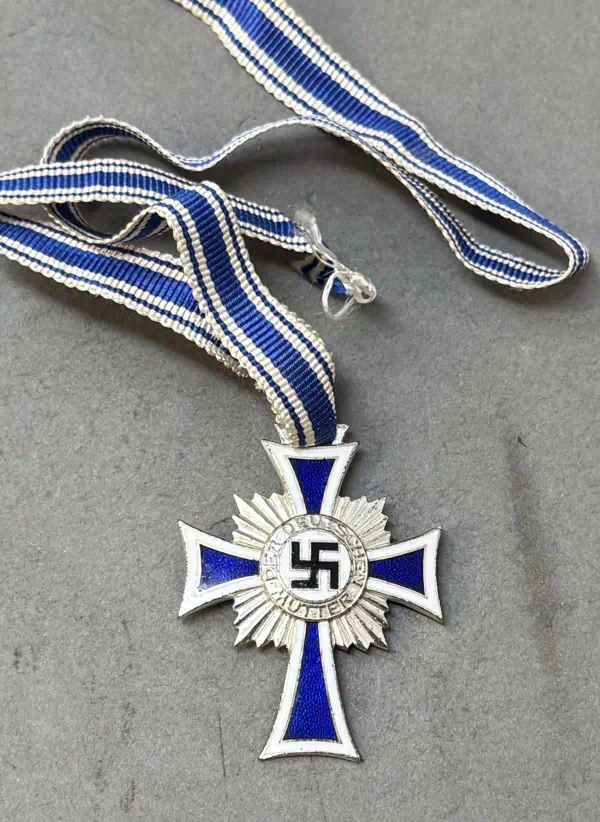 Original German Mother’s Cross Ehrenkreuz der Deutschen Mutter In Silver. The Mother’s Cross was introduced by Adolf Hitler on December 16TH 1938 as part of a large propaganda campaign aimed at increasing the birth rate. The award was officially designated, Honor Cross of the German Mother, and was instituted in three grades to recognize and reward childbearing German females. The three grades consisted of the bronze cross for bearing four or five children, the silver cross for bearing six or seven children and the gold cross for bearing eight or more children. Criteria for the award included that the parents be of pure German blood, and that the mother was worthy of such an honor. Two-piece, stamped tombac award with a bronze wash and blue and white enamel work. Award in the form of a Christian cross with outward fluted arms in semi-translucent blue enamel with white enamel border. Cross has a raised sunburst pattern emanating between its arms. Separate central circular field with white enamel base and black static swastika, encompassed by a circular border with embossed Latin script, “Der Deutschen Mutter”, (The German Mother). Reverse has impressed simulated handwritten script, “16 December 1938”, and facsimile Hitler signature. Section of original ribbon is also included (see photos). Good condition with some wear and storage age expected issues. Silver Mother Crosses are the most difficult one to find. 100% Guaranteed to be authentic Complete Museum documentation (COA) Provided. Certified by The Gettysburg Museum of History. Please see our other Mother Crosses and other items. Also note when browsing our web site there are several pages of items, at the bottom of the list look for other page numbers. OUTSTANDING EXAMPLE! Mother Crosses are getting very difficult to find and Silver is the rarest version!