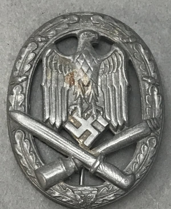 Original WWII German General Assault Badge Certified By The Gettysburg Museum Of History. The General Assault badge was introduced on June 1ST 1940, by Generaloberst Walther von Brauchitsch, for award to support personnel who were ineligible for the Infantry or Panzer Assault badges. Criteria for award of the badge was basically the same as the criteria for award of the Infantry and Panzer Assault badges with the main qualification being participation in three separate assaults in a supporting role. Die struck, solid backed, zinc construction award with a silver finish. The nicely detailed badge features a cut-out, high relief Wehrmacht styled eagle with down-swept wings positioned above a crossed bayonet and stick grenade, and encompassed by an embossed, vertically oval, oak-leaf wreath. Complete pin and catch assembly that still functions perfectly may have an old period repair on the hinge can’t really tell but thought we should mention it. (see photos). excellent quality, in good condition slight patina on the zinc. Complete museum documentation (COA) Provided. Certified by The Gettysburg Museum of History. The Gettysburg Museum of History does not support or condone Adolf Hitler or the Nazi Party and is only offering this as a historic relic. Please see our other items. Also note when browsing our web site there are several pages of items, at the bottom of the list look for other page numbers. Don’t miss this OUTSTANDING great Example.