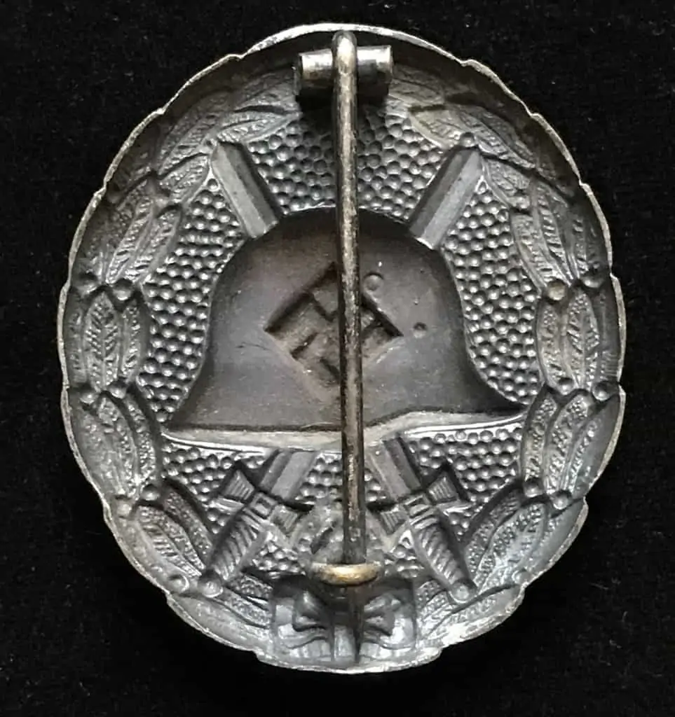 VERY RARE German 1ST PATTERN SILVER WOUND BADGE”, 1936-1939. Spanish Civil War Certified. (Verwundeten-Abzeichen, für deutsche Freiwillige im spanischen Freiheitskampf 1936-1939) The wound badge was originally established on March 3RD 1918 by King Wilhelm II to recognize the sacrifice of those wounded during WWI. The badge was instituted in three classes with the class bestowed reflecting the number or severity of the wounds received. On May 22ND 1939 Hitler re-instituted award of the black and silver WWI pattern wound badges, with the addition of the swastika, for bestowal to German volunteers, (Condor Legion), who had participated in the Spanish Civil war. Of Note: Only one hundred eighty-two black and one silver badge were awarded to Condor Legion veterans. Also Of Note: All three classes of the wound badge were re-instituted, with a slightly modified design, replacing the WWI style helmet with the new M35 style helmet, on September 1ST 1939. Die stamped, hollow backed, steel (magnetic) construction badge. The badge is in the form of a vertical oval, which is more circular then the 1939 pattern badge, with an embossed profile of a M16 pattern helmet with a canted swastika to the center superimposed over crossed swords on a pebbled base all encompassed by an oval laurel leaf wreath. The reverse of the badge is a mirror image of the obverse. The reverse has a crimped, soldered hinge, a thin round vertical pin and a soldered catch all intact. Most silver 1936 wound badges were solid backed but there were hollow backs like this. The front has a definite silver wash and is certainly the the silver grade. Brought home by a U.S. Veteran as a war trophy. Some wear from use otherwise in good condition with minor storage wear and loss to the silver wash. An honest untouched U.S. Veteran bring back German medal. 100% guaranteed to be authentic. Gettysburg Museum Certified (COA) provided. Please see our other versions of wound badges on our web site. VERY RARE!