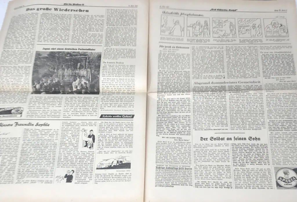 VERY RARE Original German NSDAP (NAZI PARTY) Allgemeine/Waffen SS Official SS Newspaper “Das Schwarze Korps” – 1941 Certified.  First introduced on March 6TH 1935, “Das Schwarze Korps”, (The Black Corps), was the official weekly newspaper of the SS published by the Reichsführung-SS, (High Command of the SS), under direction SS-Obergruppenführer Max Amann and editor SS-Standartenführer Gunter d’Alquen. The paper was printed by the NSDAP’s, Nationalsozialistische Deutsche Arbeiterpartei, (National Socialist German Worker’s Party) own, “Verlag Franz Eher Nachfolger”, publishing house in Munich with the editorial office in Berlin and continued in circulation until almost the end of the war as the only uncensored newspaper in Germany. In 1940 the Waffen-SS, (Armed-SS), following the German army’s lead, fielded a SS-Kriegsberichter Kompanie, (War Correspondents Company), to record the exploits of the Waffen-SS in the field. In 1941 the war correspondents company was expanded to battalion strength and further expansion in 1943 increased the war correspondents battalion to regimental strength. The reports and photographs of the Waffen-SS war correspondents were prominently featured in Das Schwarze Korps. Of Note: In 1940 SS-Standartenführer Gunter d’Alquen took over command of the newly forming war correspondents company and the editorial direction of Das Schwarze Korps was passed to Kurt Eggers until his death in August 1943. A 33cm x 47cm newspaper dated 1941″ that is made up of eight pages each that contain  some very minor storage wear.100% guaranteed to be authentic with Museum COA (Certificate Of Authenticity). SS items are the most superb and desirable artifacts from the Third Reich. We only get the opportunity offer these very rarely. DO NOT MISS THIS! OUTSTANDING EXAMPLE!