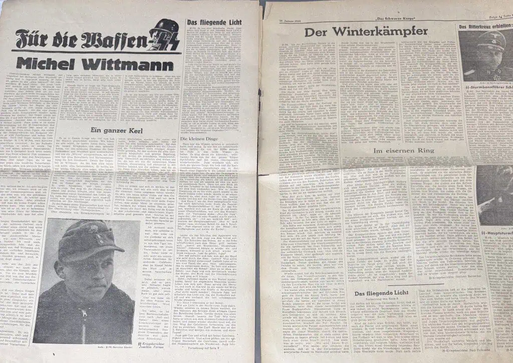VERY RARE Original German NSDAP (NAZI PARTY) Allgemeine/Waffen SS Official SS Newspaper “Das Schwarze Korps” – 1944 Certified.  First introduced on March 6TH 1935, “Das Schwarze Korps”, (The Black Corps), was the official weekly newspaper of the SS published by the Reichsführung-SS, (High Command of the SS), under direction SS-Obergruppenführer Max Amann and editor SS-Standartenführer Gunter d’Alquen. The paper was printed by the NSDAP’s, Nationalsozialistische Deutsche Arbeiterpartei, (National Socialist German Worker’s Party) own, “Verlag Franz Eher Nachfolger”, publishing house in Munich with the editorial office in Berlin and continued in circulation until almost the end of the war as the only uncensored newspaper in Germany. In 1940 the Waffen-SS, (Armed-SS), following the German army’s lead, fielded a SS-Kriegsberichter Kompanie, (War Correspondents Company), to record the exploits of the Waffen-SS in the field. In 1941 the war correspondents company was expanded to battalion strength and further expansion in 1943 increased the war correspondents battalion to regimental strength. The reports and photographs of the Waffen-SS war correspondents were prominently featured in Das Schwarze Korps. Of Note: In 1940 SS-Standartenführer Gunter d’Alquen took over command of the newly forming war correspondents company and the editorial direction of Das Schwarze Korps was passed to Kurt Eggers until his death in August 1943. A 33cm x 47cm newspaper dated 1944″ that is made up of eight pages each that contain  some very minor storage wear.100% guaranteed to be authentic with Museum COA (Certificate Of Authenticity). SS items are the most superb and desirable artifacts from the Third Reich. We only get the opportunity offer these very rarely. DO NOT MISS THIS! OUTSTANDING EXAMPLE!