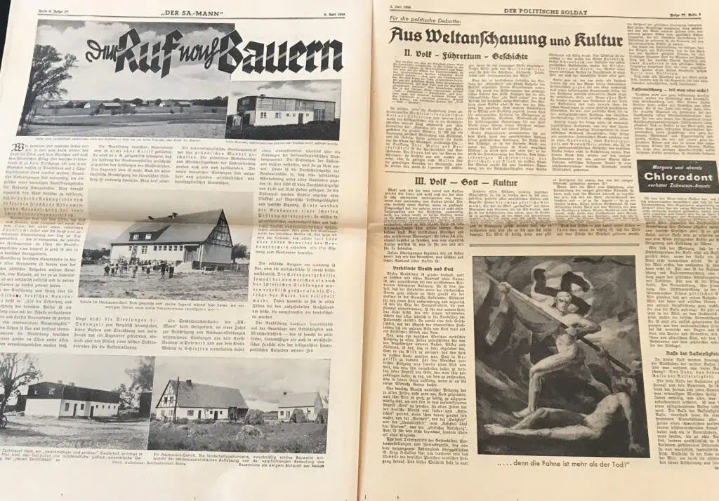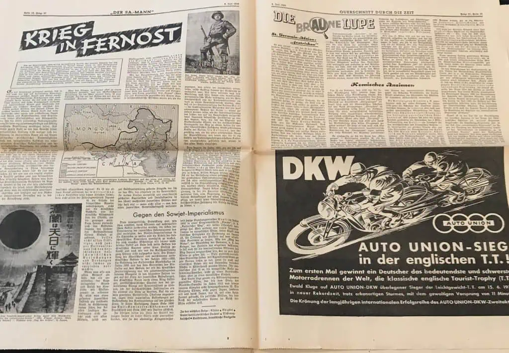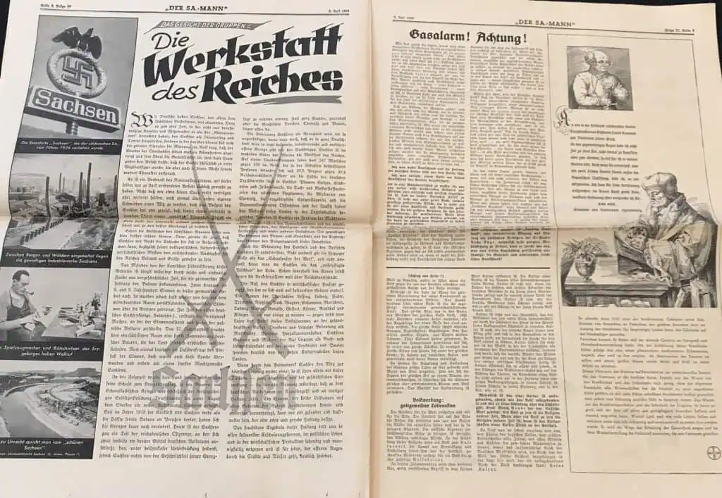 VERY RARE Original German NSDAP (NAZI PARTY) DER SA MAN Newspaper For The German Brown Shirts Certified. . A large party newspaper for the SA (Brown Shirts). A Approximately 45cm x 54cm, The newspaper shows yellowing typical of age, as well as wear to the heavy fold lines to the different sections that contain some very minor storage wear. These are very large compared to most period German papers so we are not photographing every page. 100% guaranteed to be authentic with Museum COA (Certificate Of Authenticity). Early Nazi Party items are the most superb and desirable artifacts from the Third Reich. We only get the opportunity offer these very rarely. DO NOT MISS THIS! OUTSTANDING EXAMPLE! SA Brown Shirt ! Historic edition 1938!!