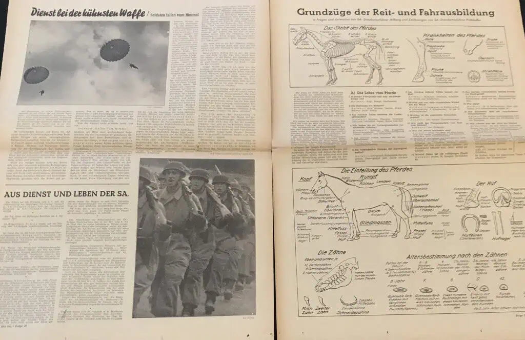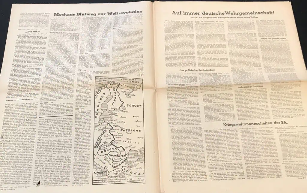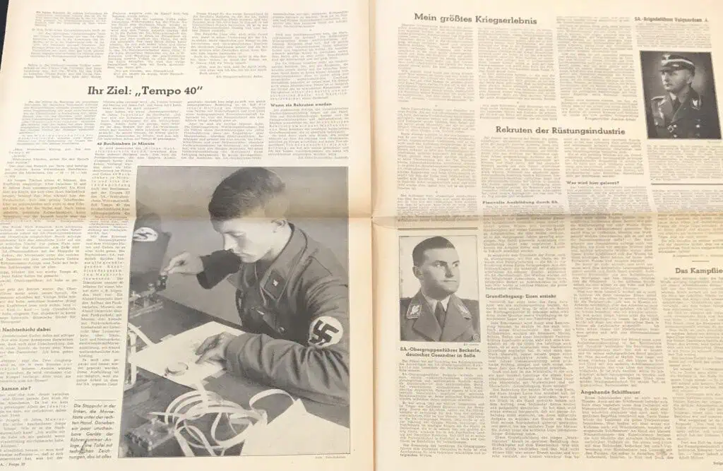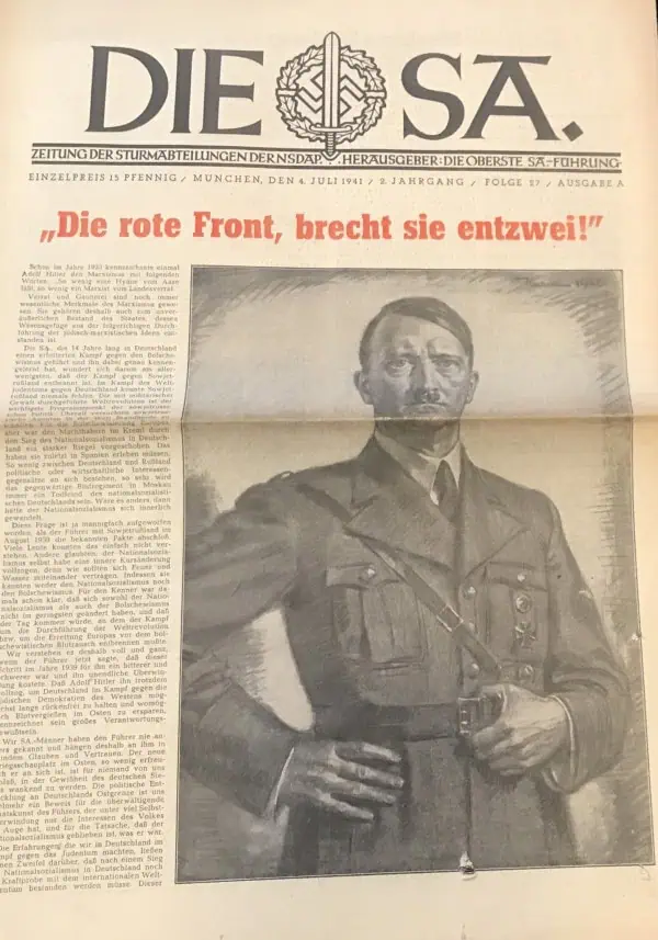 VERY RARE Original German NSDAP (NAZI PARTY) DIE SA Newspaper For The German Brown Shirts Certified. . A large party newspaper for the SA (Brown Shirts). A Approximately 45cm x 54cm, The newspaper shows yellowing typical of age, as well as wear to the heavy fold lines to the different sections that contain some very minor storage wear. These are very large compared to most period German papers so we are not photographing every page. 100% guaranteed to be authentic with Museum COA (Certificate Of Authenticity). Early Nazi Party items are the most superb and desirable artifacts from the Third Reich. We only get the opportunity offer these very rarely. DO NOT MISS THIS! OUTSTANDING EXAMPLE! SA Brown Shirt ! Historic edition 1941!!