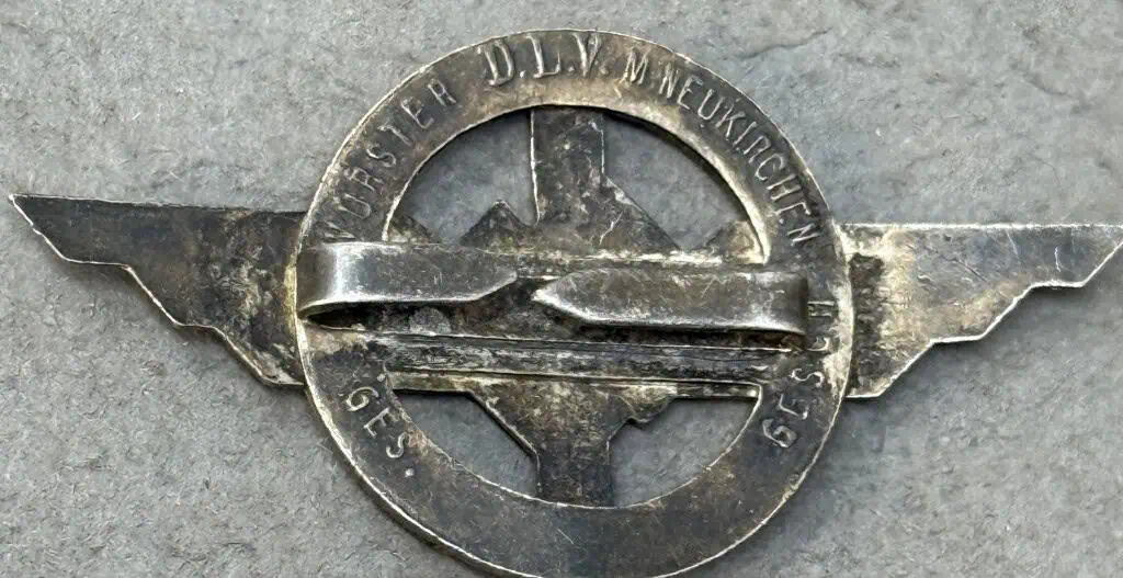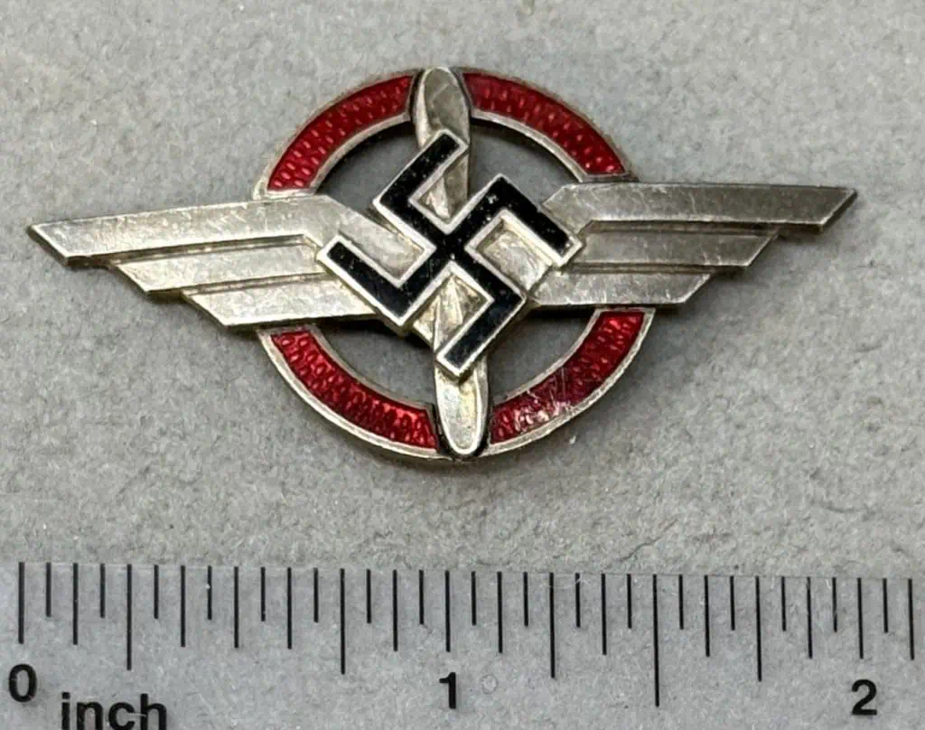 VERY RARE Original German NSDAP (NAZI PARTY) DLV VISOR CAP INSIGNIA. (Mützenabzeichen) Certified. The DLV, “Deutscher Luftsport Verband” (German Air-sport Association), was established by forcibly, although legally, incorporating all civilian flying clubs, as well as the flying units of the SA and SS, into it in 1933. After 1935, when the secrecy regarding aerial re-armament was lifted, it served mostly as an Air force reserve and training ground for future members of the Luftwaffe. It was itself incorporated into the NSFK, “Nationalsozialistisches Fliegerkorps” (National-socialist Flying-corps), in 1937. A Type “A” insignia, worn to the front of the visor cap band, in the form of a black enamel mobile swastika against an upright, silver propeller, to either side which extend three-tiered silver wings, with a span of 70mm, all against a red enamel ring. To the reverse of each wing is the two prongs for attaching to the cap. Nicely maker marked. Scarce issued example that shows the expected age, wear and use. In good but used condition. Gettysburg Museum Certified (COA) provided. 100% Guaranteed to be authentic brought home by a U.S. Veteran. Sold for historic purposes only. See our other pieces on our web site. Also note when browsing our web site there are several pages of items, at the bottom of the list look for other page numbers. UNTOUCHED EXAMPLE! DO NOT MISS THIS! VERY RARE!