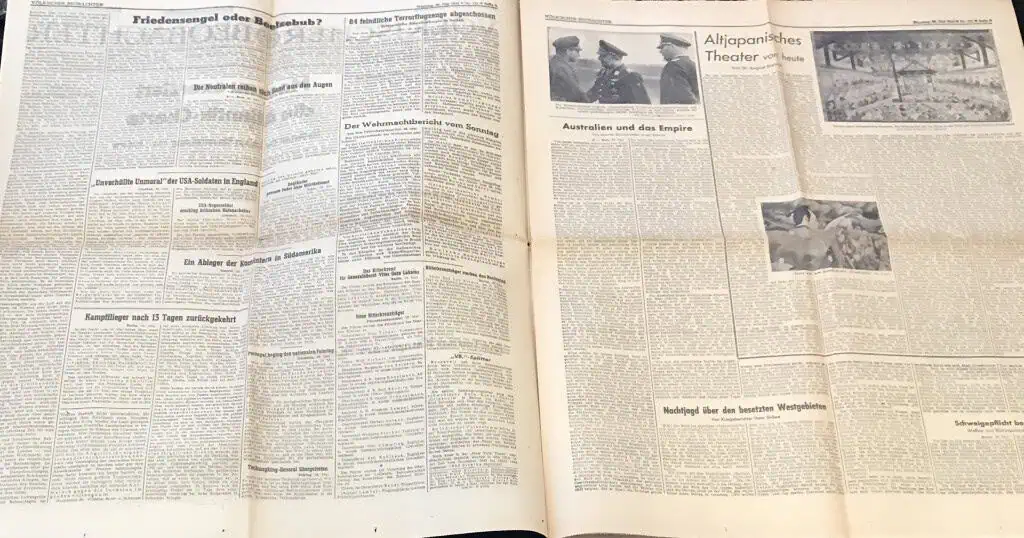 VERY RARE Original German NSDAP (NAZI PARTY) “VOLKISCHER BEOBACHTER” NEWSPAPER. (Zeitung) Certified. A simple party newspaper with daily commuters in mind. A Approximately 45cm x 54cm, The newspaper shows yellowing typical of age, as well as wear to the heavy fold lines to the different sections that contain some very minor storage wear.100% guaranteed to be authentic with Museum COA (Certificate Of Authenticity). Early Nazi Party items are the most superb and desirable artifacts from the Third Reich. We only get the opportunity offer these very rarely. DO NOT MISS THIS! OUTSTANDING EXAMPLE! NAZI PARTY EDITION! Historic edition 1944!!