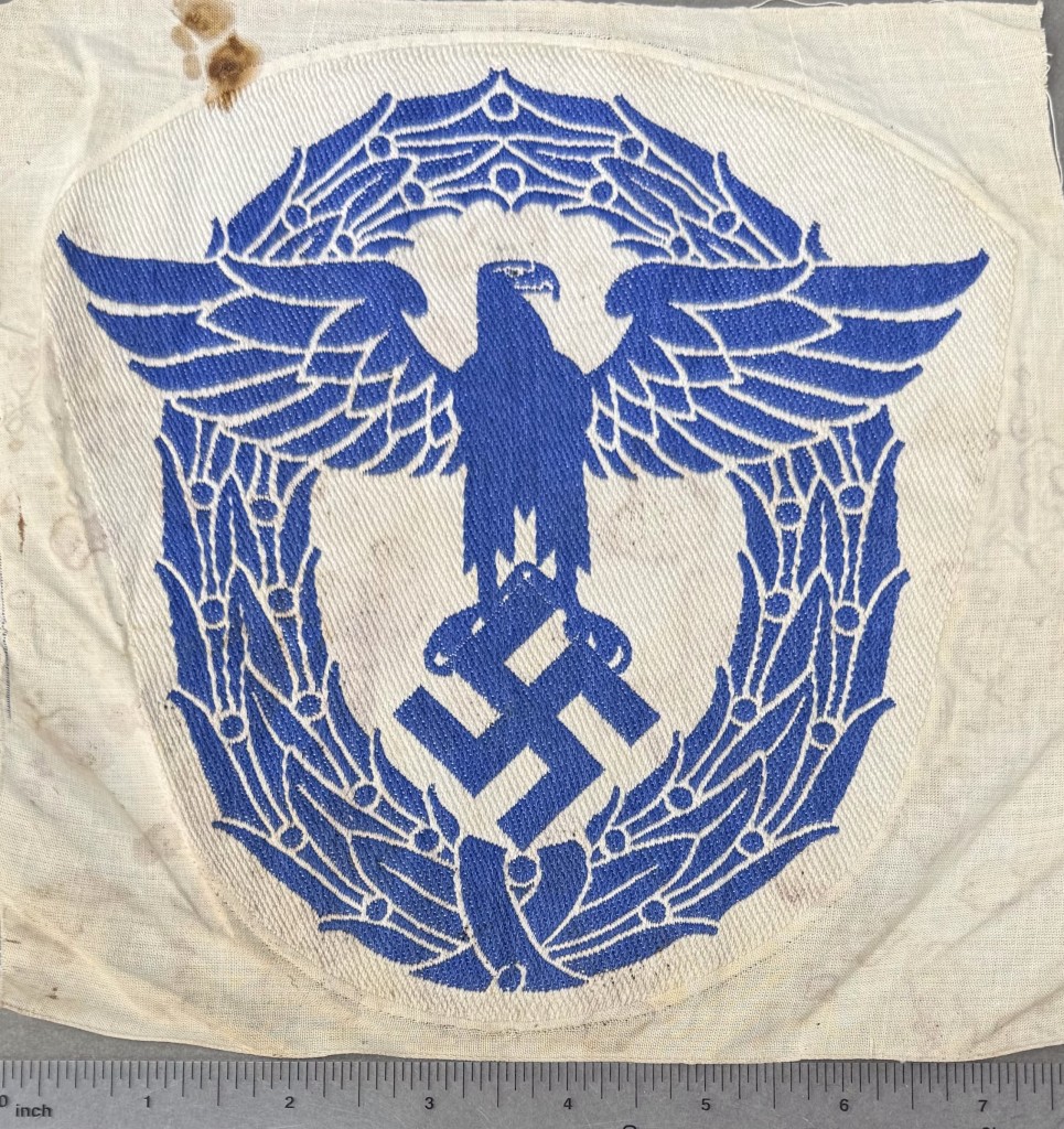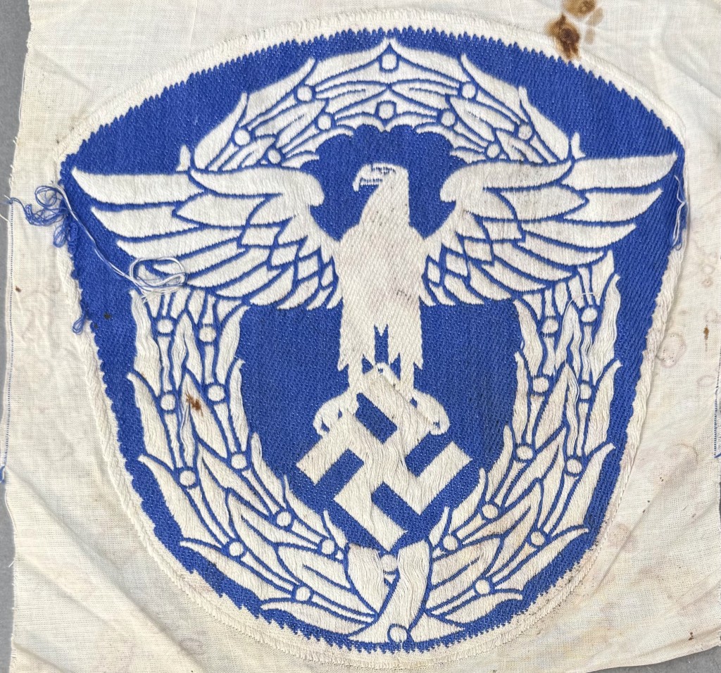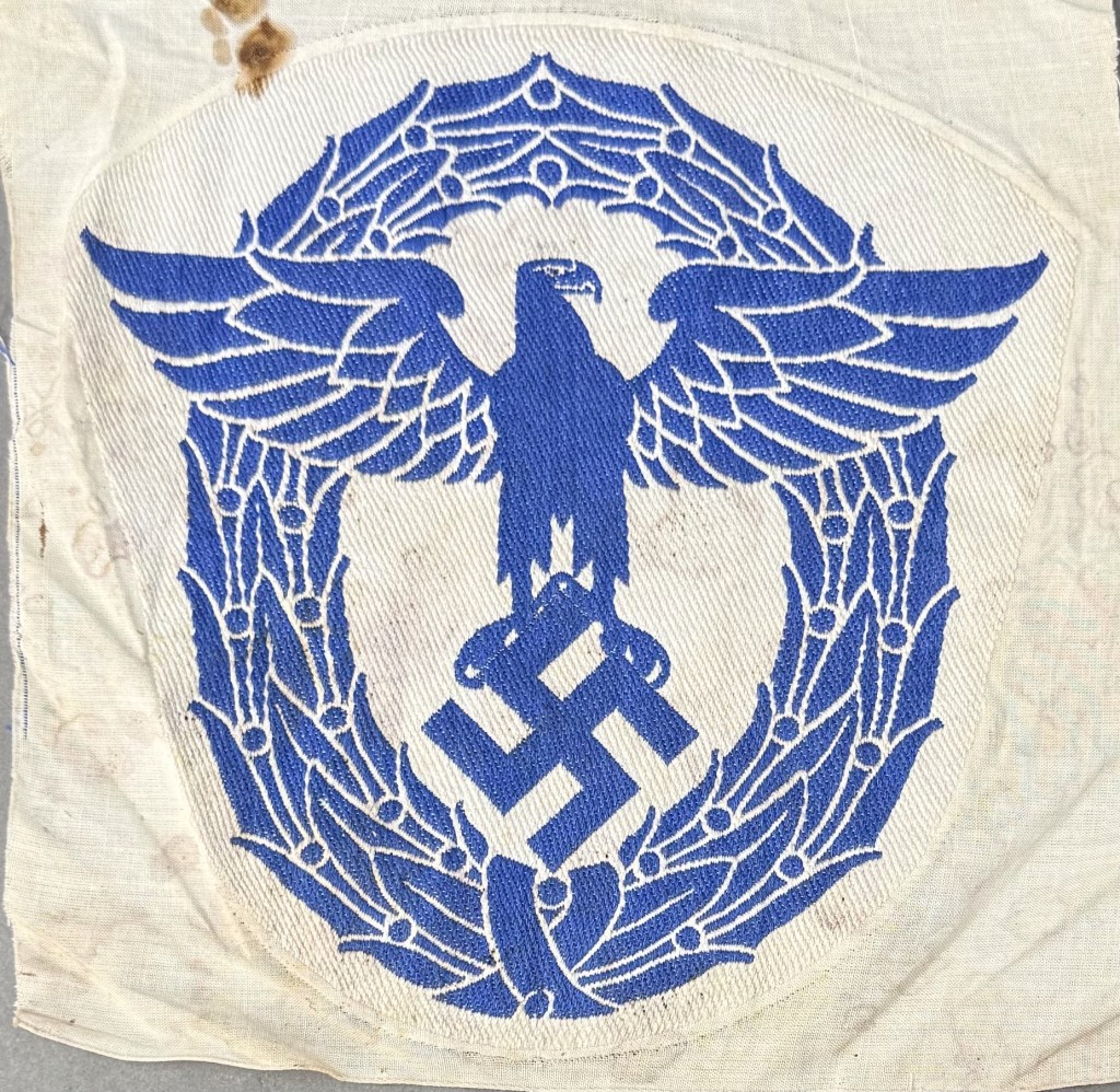 RARE Original WWII German Water POLICE Sports Shirt Insignia Certified. Physical fitness of its personnel was a prime concern of the German police, and each new recruit was issued a specific sport uniform that consisted of a pullover “tank top” style shirt, navy blue or white short pants and athletic shoes. It is believed regulations concerning the Police sports dress were first addressed by Reichsführer-SS Heinrich Himmler on June 25TH 1936 to bring about uniformity in dress for all police through-out the country. Originally the sports shirt was worn with the second pattern, (Circa June 1936-May 1945), This unissued Water Police Sport Shirt Insignia has a great look. It’s typical Bevo machine woven construction. The front features a beautifully detailed rendition of the wreathed eagle and swastika Polizei emblem, in light blue thread (indicating Water Police) on a white background. All of the original thin white backing fabric is still present. The back of this Water Police Sport Shirt Insignia shows details of the machine weaving. This patch is really nice, clean and crisp, with full original color. There are no holes, stains or other damage, and no signs of wear or of ever having been sewn to anything. There is only extremely slight age toning to the white fabric. Overall, this attractive piece of Polizei insignia rates near mint. Nice untouched example. has that great look! .100% Guaranteed to be authentic. Complete museum documentation (COA) Provided. Please see our other German Medals and Relics From WWII. Also note when browsing our web site there are several pages of items, at the bottom of the list look for other page numbers. OUTSTANDING RARE EXAMPLE! Don’t miss it! NICE VERY RARE BIG EAGLE!