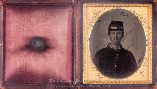 The Confederate musketball that took the arm of Charles Sprauge during Pickett’s Charge Gettysburg. This ball crashed into the arm of Sprauge while he was manning the cannon Alonzo Cushing was commanding. Sprauge was in Battery A 4th U.S. Artillery. Sprauge was taken to the hospital and the ball was removed and he kept the ball. Later his arm became infected and had to be amputated. Alonzo Cushing, his commander received the Medal of Honor. Cushing kept fighting even with his intestines coming out from wounds. Cushing later died of his wounds. Battery A kept fighting pouring double canister into the advancing Confederates at the bloody angle of Pickett’s Charge.![]()