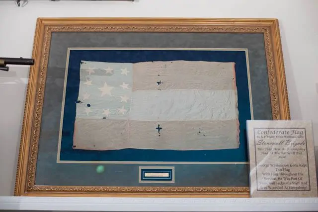 A Civil War Confederate flag flown at the battle of 1st Bull Run, Mananas Virginia. This company size 1st National Confederate flag was given to George Washington Kurtz of the Stonewall Brigade by his family. It flew at First Bull Run. He kept the flag with him after they received their official colors. He had this flag on him when he was captured at the battle of Gettysburg. This flag can be seen in the painting in this post on the far right. This flag was formerly exhibited at the Mananas National Park. It is now at The Gettysburg Museum of History on permanent display.