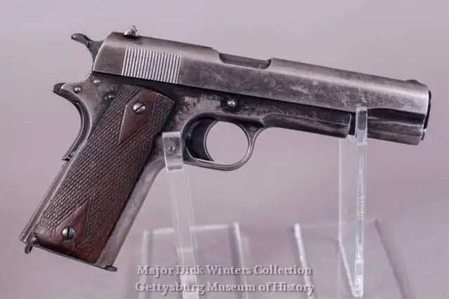 Major Dick Winters M-1911 Colt .45 Automatic Pistol Used In WWII. This Pistol Was Issued Sometime During Winters Early Training. He Had It Throughout His Service In WWII. The Photo Of Winters In His Helmet Is Winters At Carentan During The Normandy Campaign. The Other Photo Is Winters Near The End Of WWII. In Both Photos You Can See His .45 In The Holster On His Right Hip.